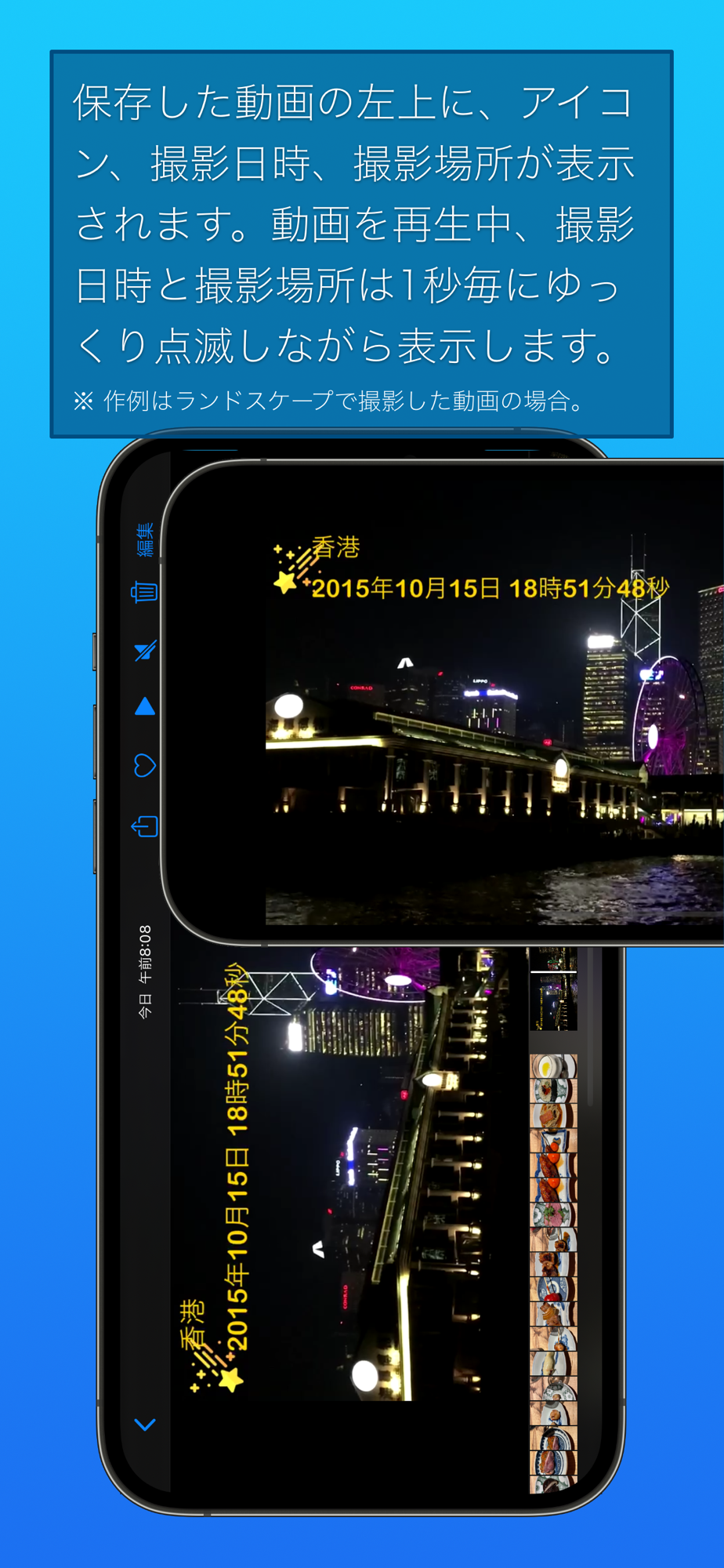 動画に撮影日時と撮影場所、アイコンなどを貼り付けたら、新しい動画としてフォトライブラリーに保存します。オリジナルの動画はそのままです。