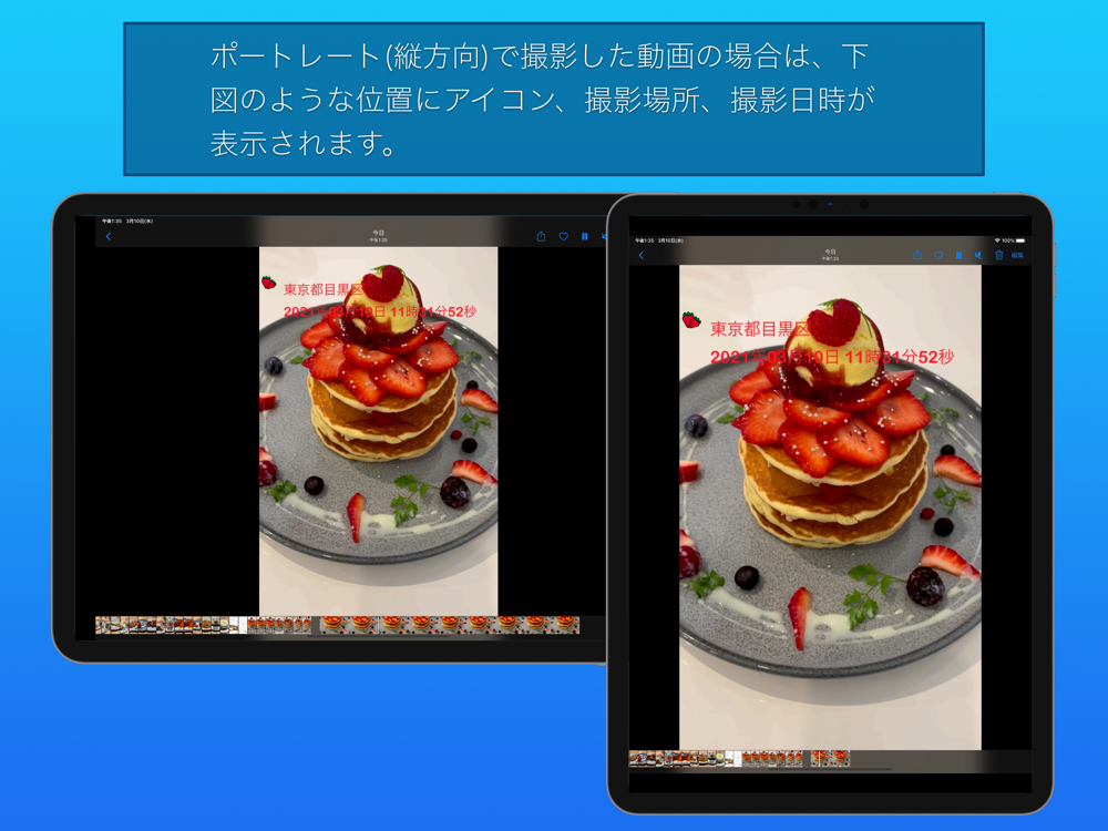 フォトライブラリーで管理している動画をアプリで選択すると、動画に記録されている撮影日時と撮影場所(位置情報の記録がされている動画に限る)を自動的に読み取ります。