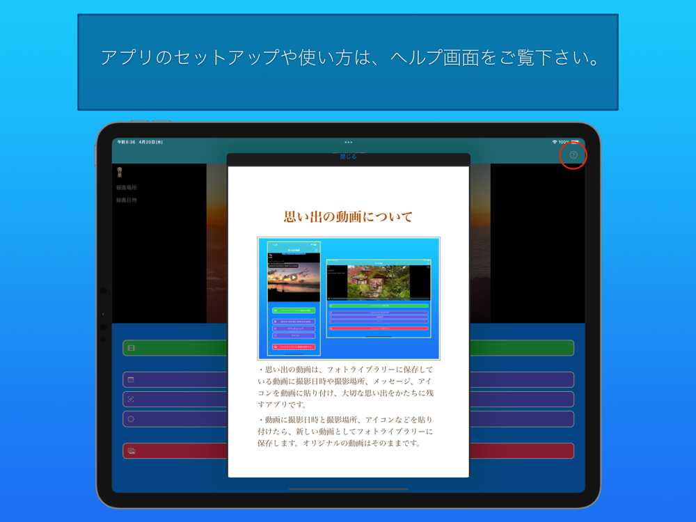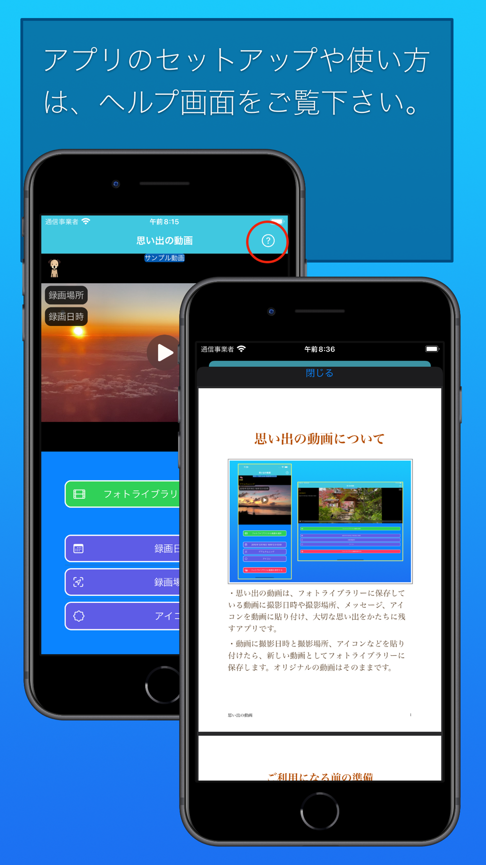 思い出の動画は、フォトライブラリーに保存している動画に撮影日時や撮影場所、メッセージ、アイコンを動画に貼り付けて大切な思い出をかたちに残すアプリです。