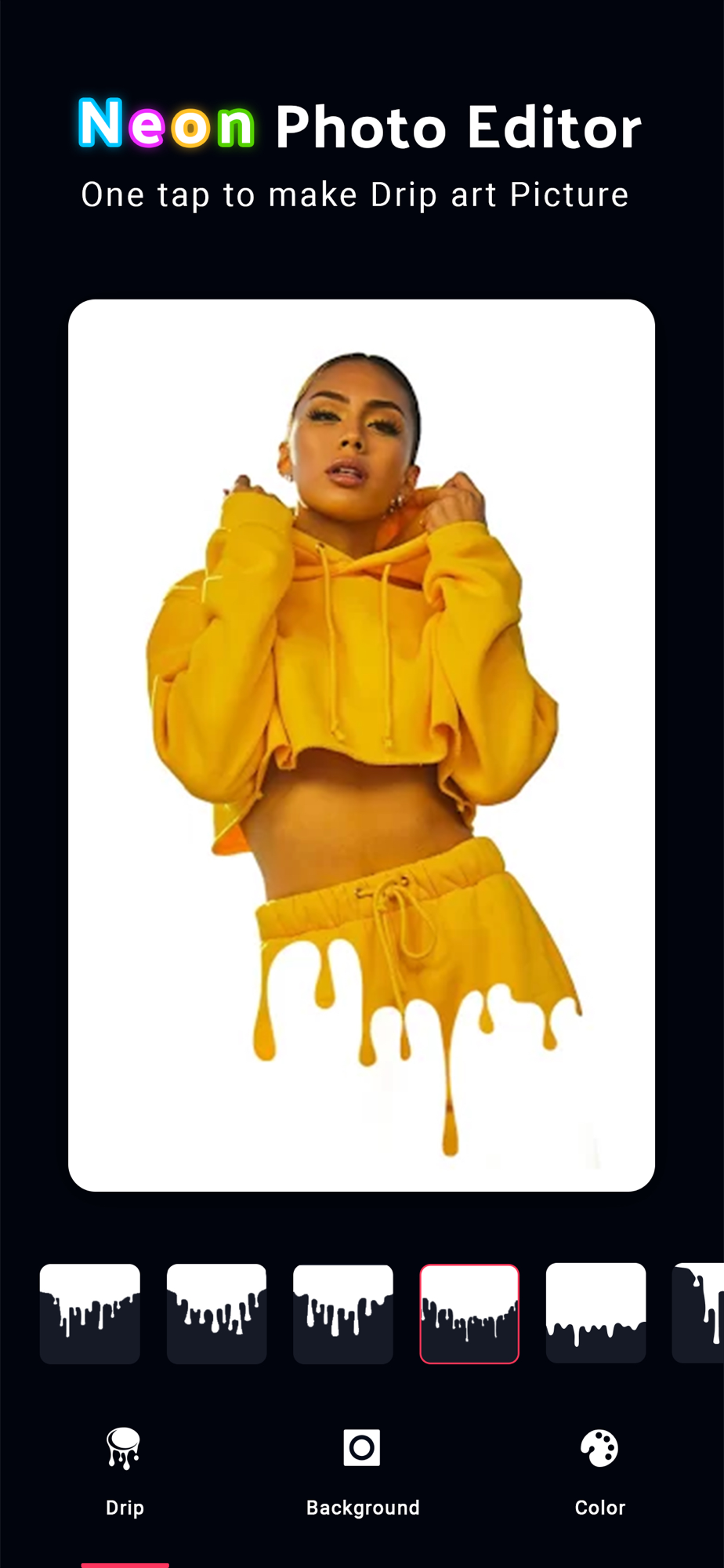 Neon Photo Editor - Auto Background Changer with Drip effect brings some motion to your photo, Unleash your inner drip artist with the awesome dripping effect and style. You can arrange the drip style and background color instantly.