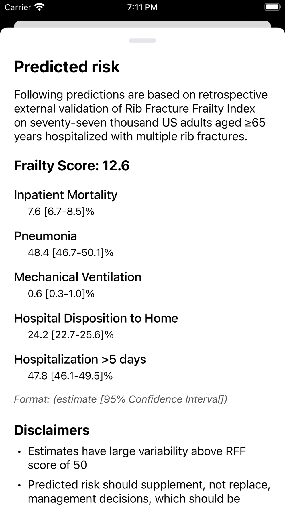 The Rib Fracture Frailty Index was developed to rapidly characterize baseline frailty of older adults (age ≥65 years) admitted with traumatic rib fractures. Users will be provided with a RFF score, risk of frailty (low, medium, high), and population-level estimates of rib fracture-specific outcomes based on baseline frailty.