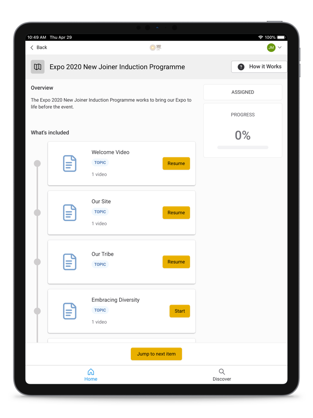 The Expo 2020 Online Learning Platform is the AI-powered learning platform that helps you remember to do the things that matter on-the-job. It delivers personalised, bite-sized bursts of information that is fun, fast and engaging. It's just 3-5 minutes of daily training to remind you of the critical information you need, so when it's time to act you'll know just what to do.