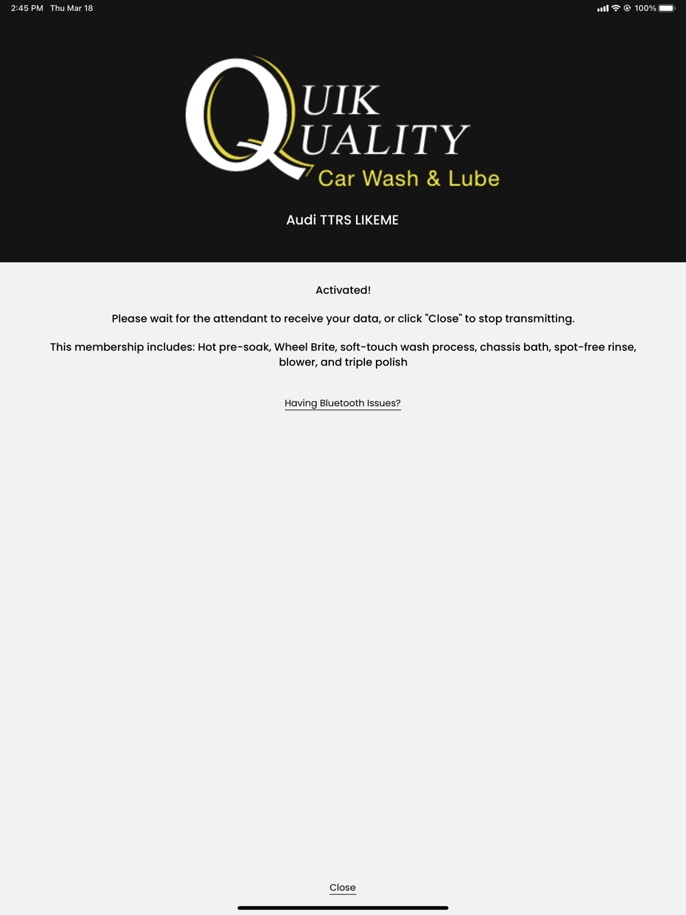 The membership application for Quik Quality Car Wash in Harrisburg, PA. Once you sign-up for our membership program. You do not have to worry about a membership car or a sticker as your phone becomes your hands free access to your car washing at our location by bluetooth beacons. You select the car you are in and enable bluetooth and sit back as our attendants will pickup your membership on their devices and wave you through.