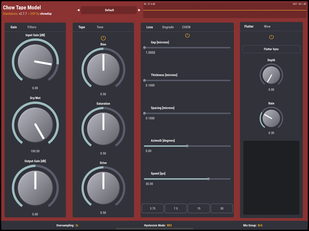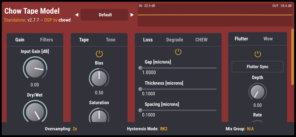 CHOW Tape Model is a physical model of an analog tape machine, implemented as an audio plugin. The model has parameters for tape distortion, playhead loss, wow/flutter, tape degradation, and more. Originally designed to emulate the Sony TC-260 reel-to-reel tape machine, the current version can emulate a wide range of tape machines and tape types.