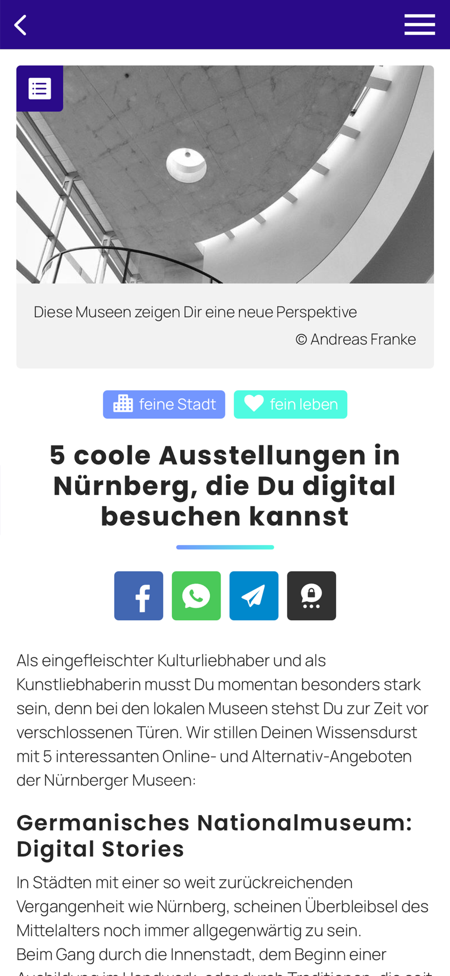 Wir informieren Dich unkompliziert in unseren vier Rubriken, die Dein Leben in Nürnberg, Fürth und Erlangen noch schöner machen. Enjoy.