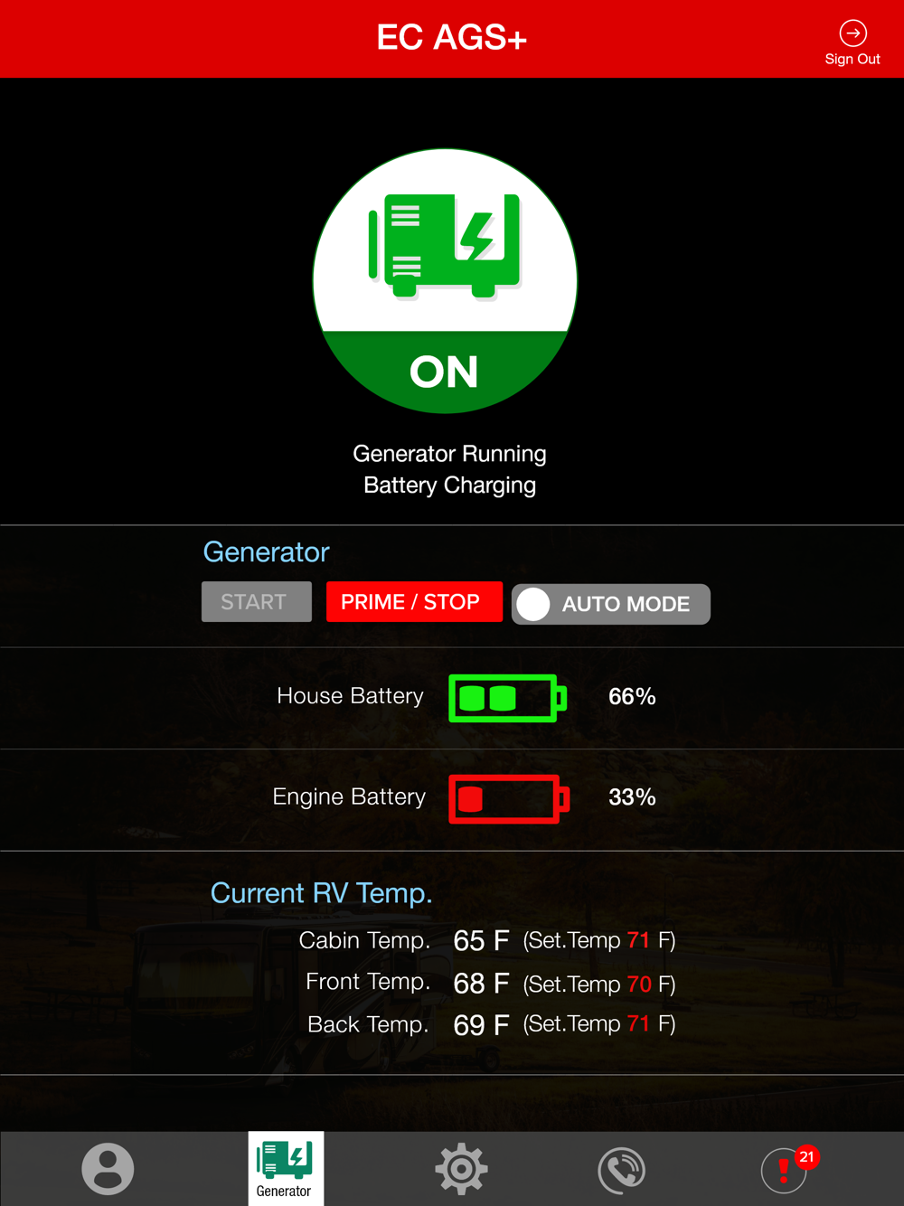 The Energy Command Auto Gen Start (AGS+) allows you to remotely monitor and manage your RV generator and set up automatic generator starting, all from your mobile device. With an easy-to-use and friendly mobile interface, it sends notifications and gives you access to your generator. Note: This app requires an EC-AGS+ device installed in your RV to work. Among the features included: