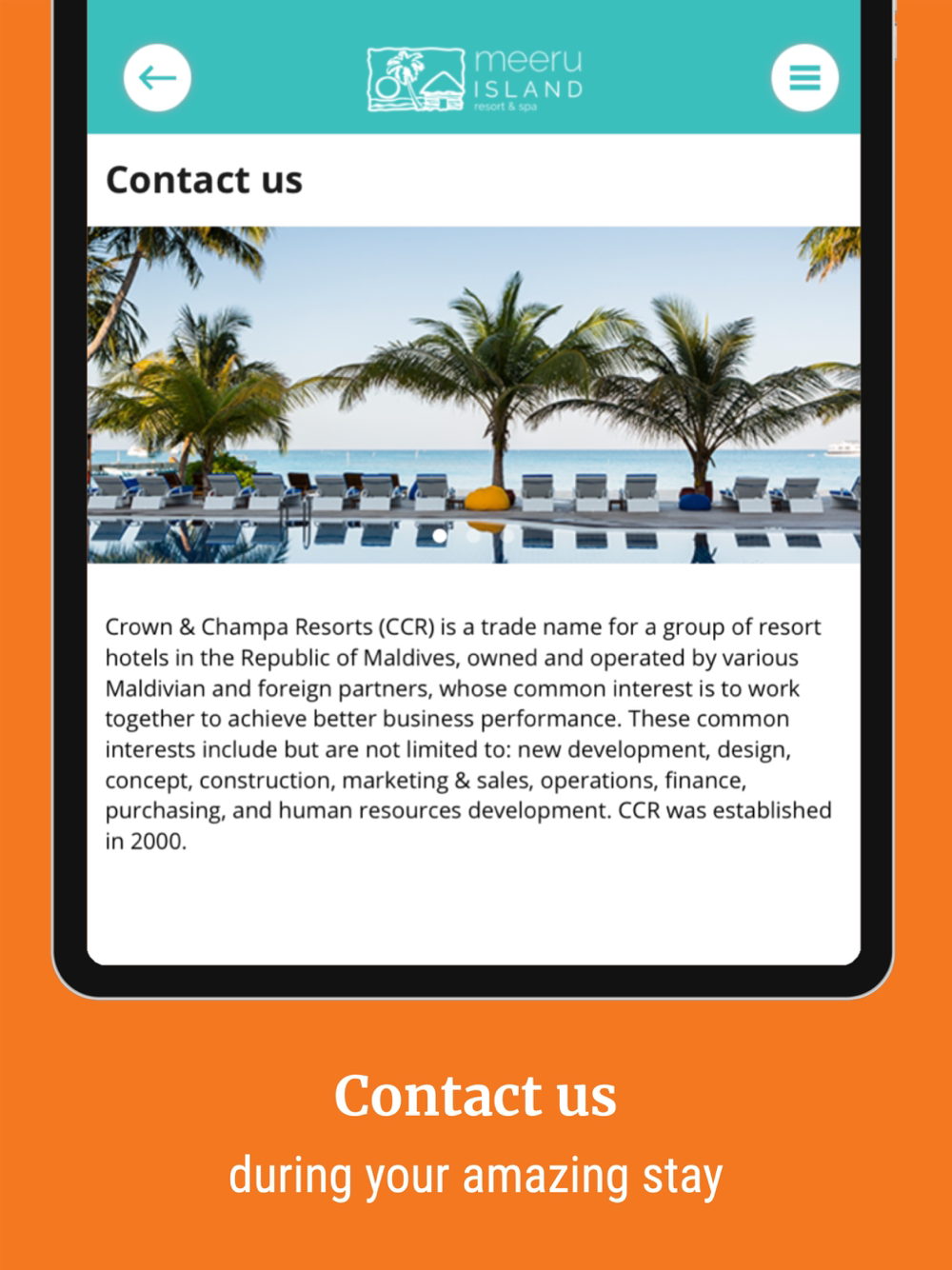 Explore Meeru Island Resort & Spa and its stunning facilities, plan your visit and activities from your device before and during your visit,