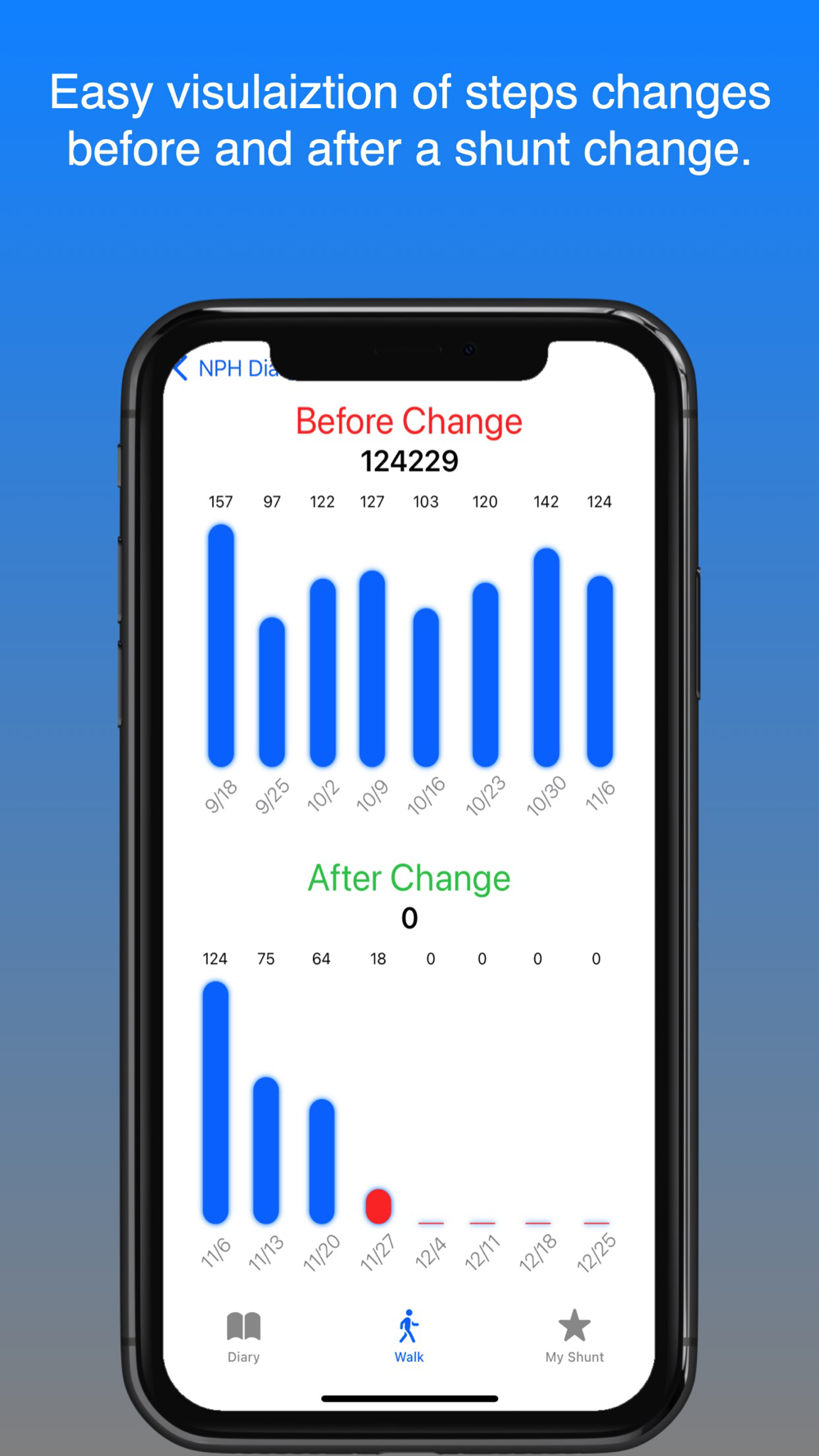 A diary for patients who suffer from normal pressure hydrocephalus and have underwent shunt placement. This allows for journal entries to indicate changes in gait and walking, document symptoms, and also keep track of changes in shunt settings.