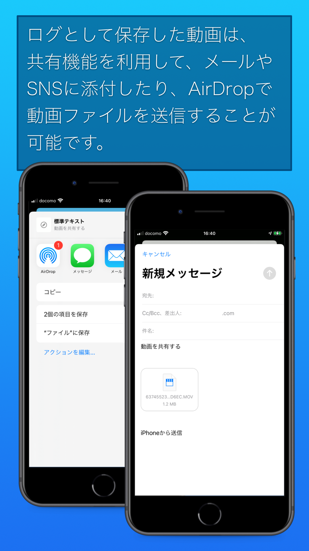 録画した動画は、共有機能を利用して、メールやSNSに添付したり、AirDropで動画ファイルを送信することが可能です。