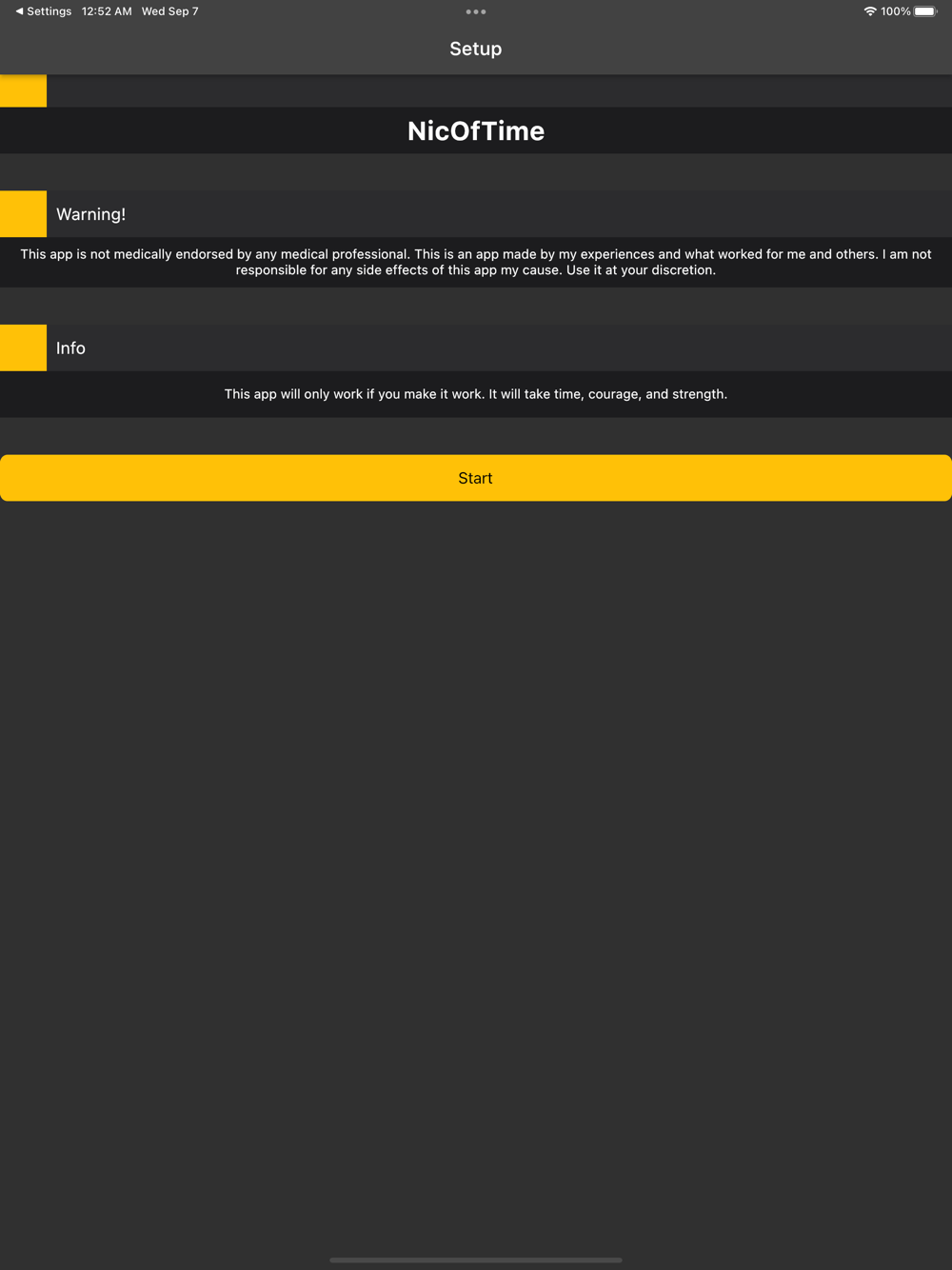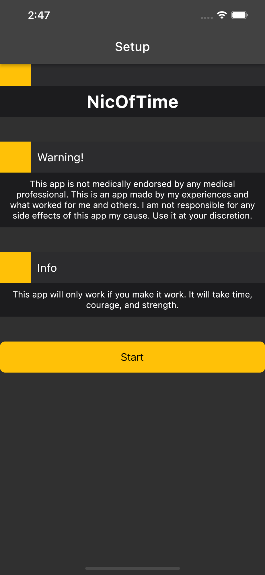 NicOfTime is a new way for people to stop their nicotine addiction, saving there life and money. By using an adaptive algorithm, it can scale to anyone's life. It will scale down their nicotine addiction day by day until your addiction has stopped.