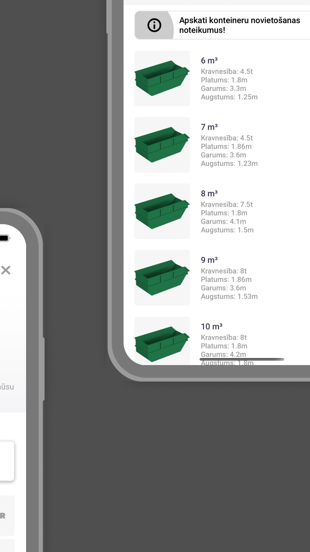 Mūsu klients ir ikviens, kam nepieciešama lielgabarīta atkritumu izvešana vai būvgružu konteineru noma. Nav svarīgi vai tas ir liels objekts vai neliela vasarnīca, dzīvokļa remonta gruži, veco mēbeļu izvešana vai daudzdzīvokļu mājas būvēšana - mūsu aplikācijā pieejami visi būvgružu konteineru izmēri no 5.5m3 līdz 40m3.