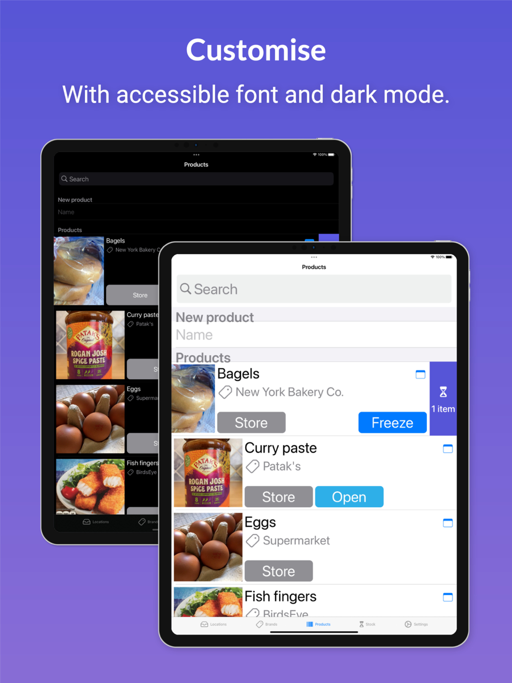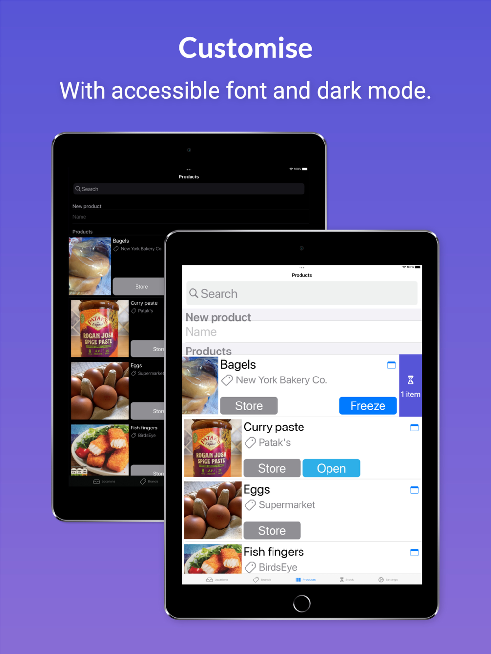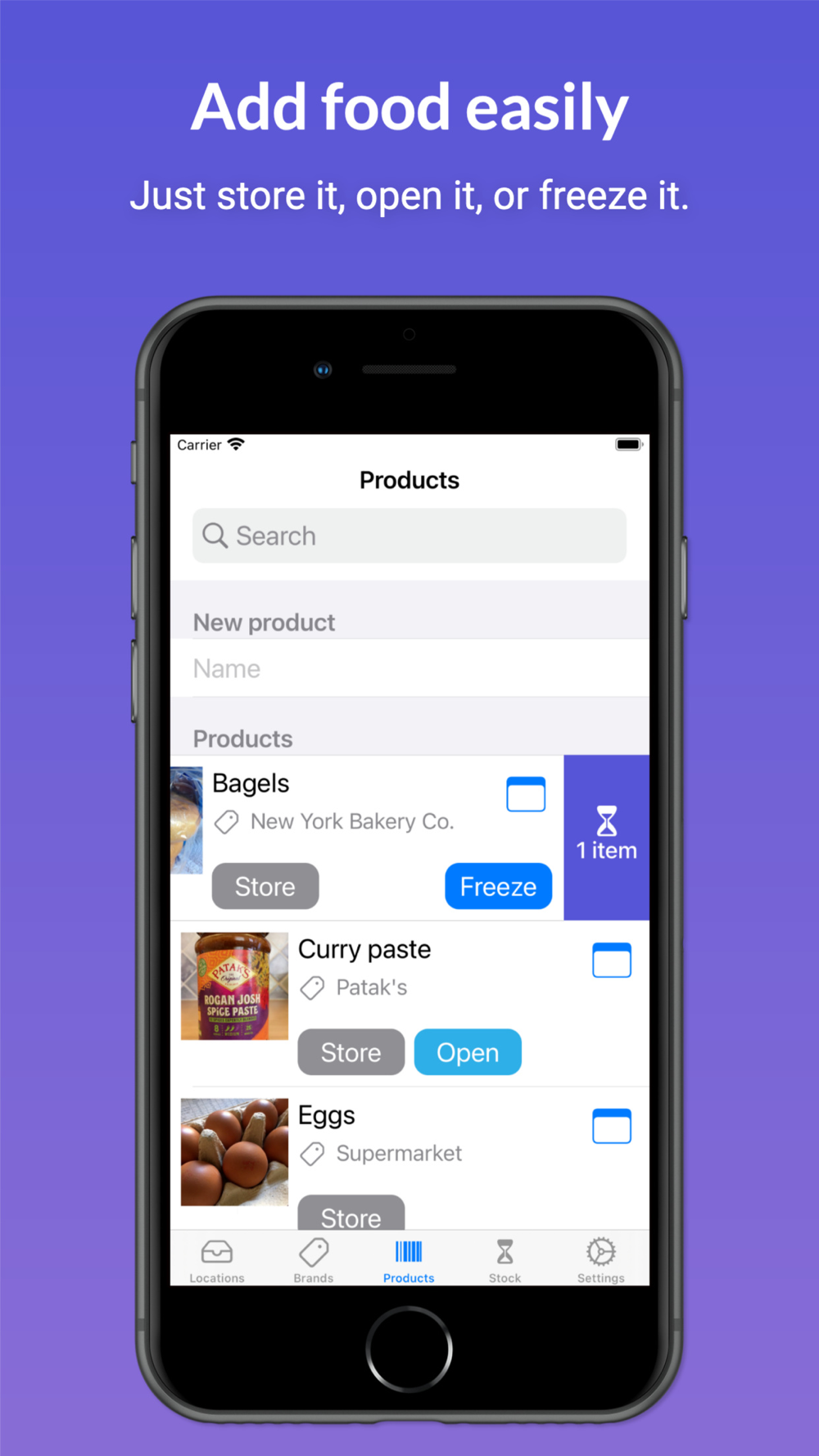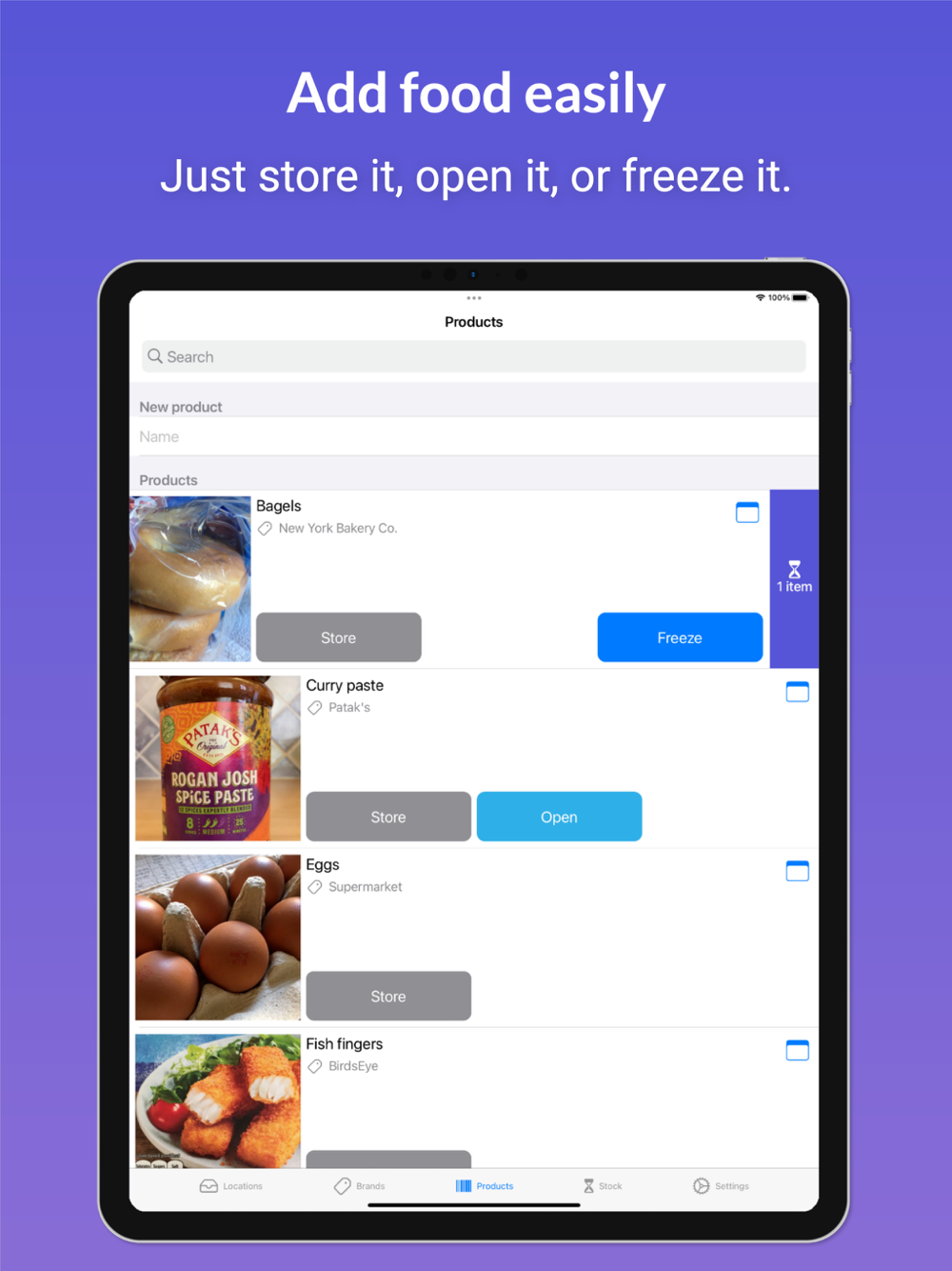 Adding food is easy with a product-based action system. Products can be actioned over and over again. Simply store, open, or freeze a product, to instantly create a new item in stock.