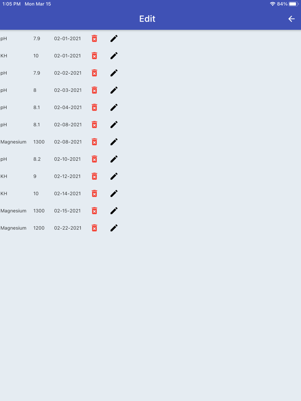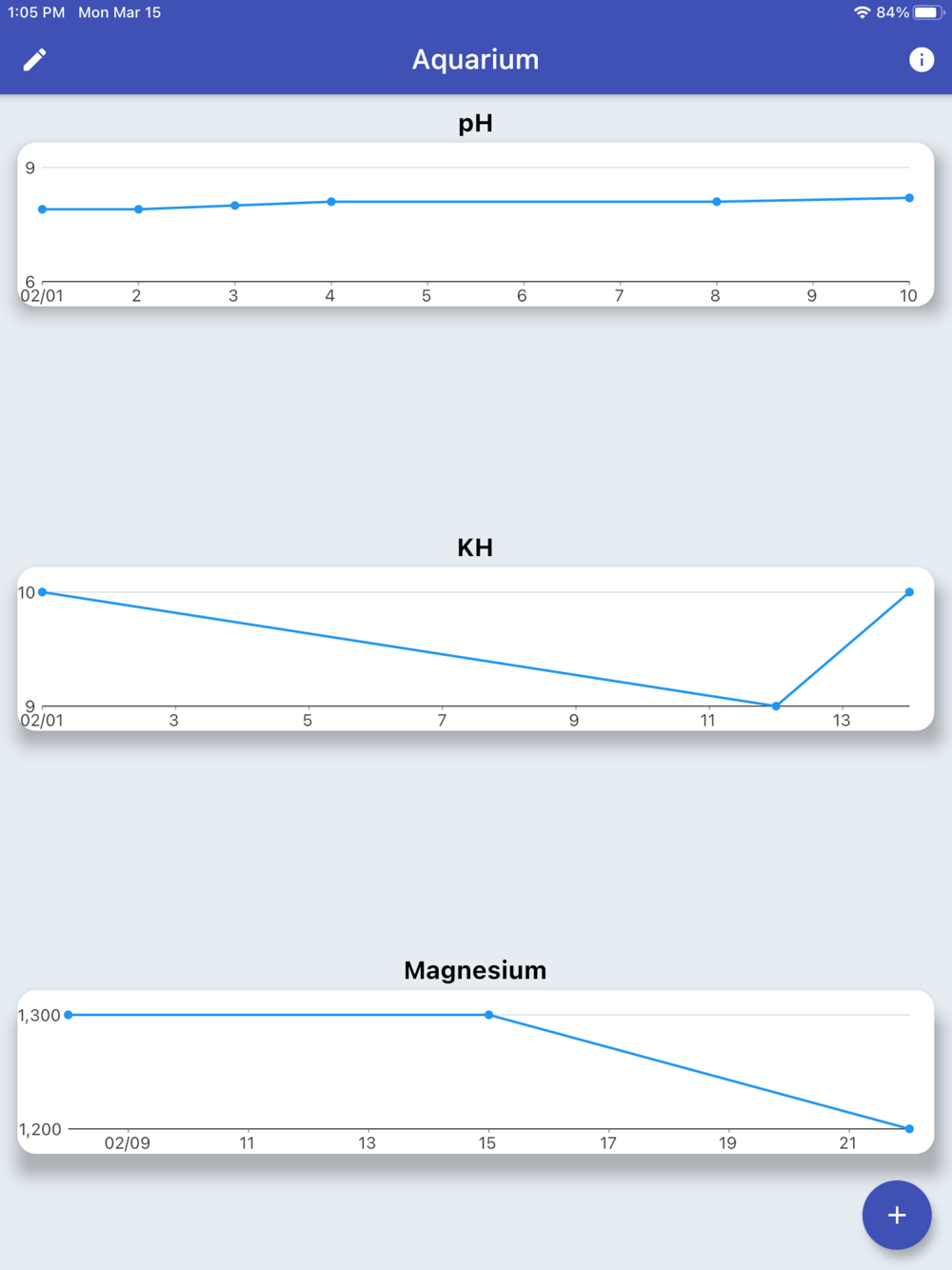 An easy to use app to track your aquarium water parameters. Great for fresh or salt water aquariums. View the data in easy to read automatically generated graphs. Edit or delete any existing test results. Water test results / parameters tracked include: