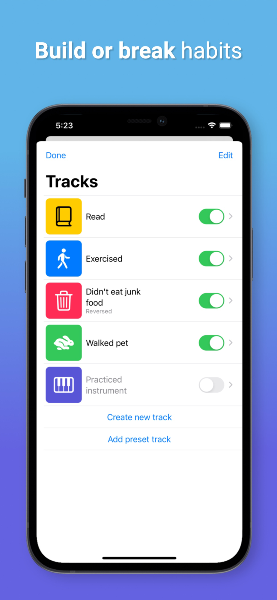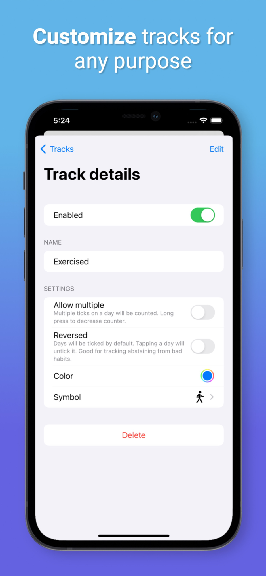 Tickmate allows you to track any daily occurrences. It is a is a 1-bit journal, meaning each day is either ticked or not. You can track anything from habits you wish to build or break to how often you wash your hair.