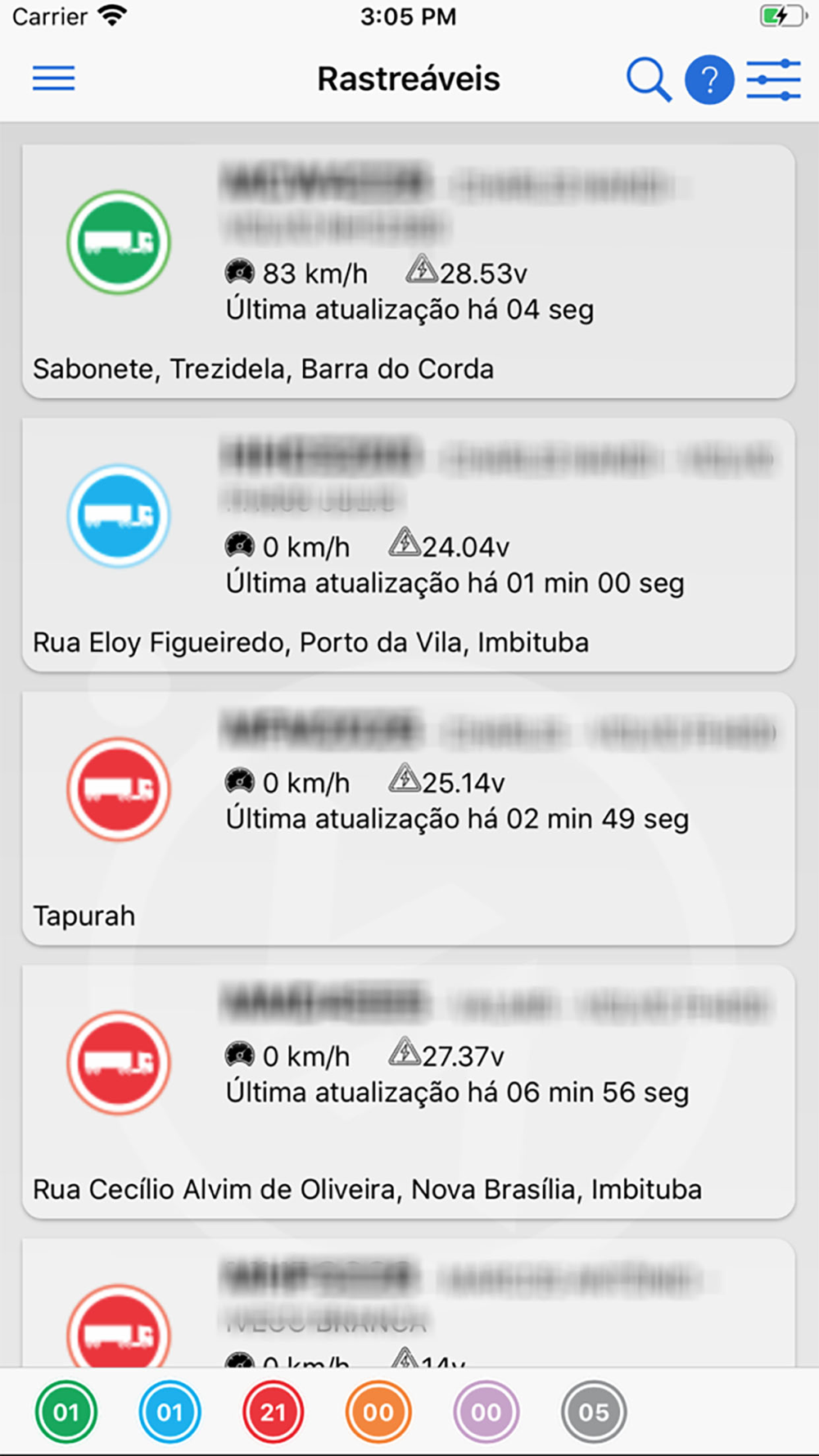 - Lista completa de rastreáveis em tempo real, com endereço da localização e velocidade. Totalizados e separados por status, permitindo identificar quais estão onLine, offLine, em movimento ou parados, com ignição ligada ou desligada.