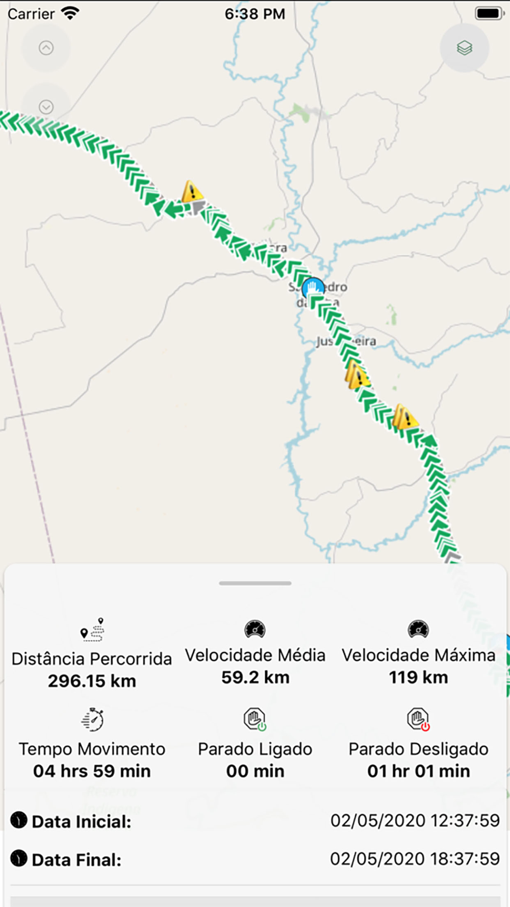 - Histórico completo, permitindo estabelecer a hora inicial e hora final desejada, com listagem completa de todas as posições encontradas, destacando o tempo que ficou parado ligado ou desligado em cada posição. Resumo do histórico indicando totais de quilômetros, tempo em movimento, tempo parado ligado, tempo parado desligado, velocidade média e máxima.