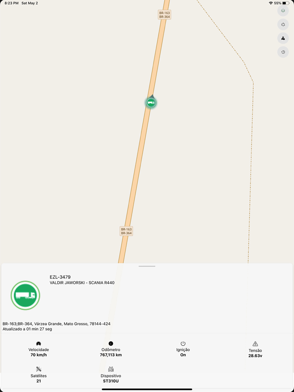 - Mapa ao vivo mostrando todos os seus rastreáveis ou individualmente, com ícones personalizados identificando o status e direção do rastreável. Várias informações do rastreável em tempo real, como: velocidade, tensão da bateria, qualidade do sinal GPRS, quantidade de satélites GPS, odômetro, horimetro, status de entradas, motorista identificado, entre outras.
