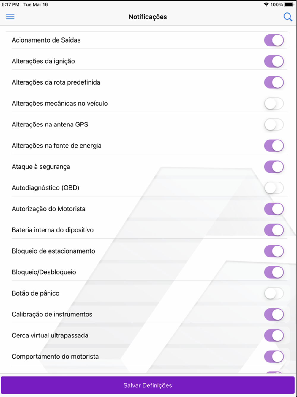 - Notificações push personalizadas, onde o próprio usuário escolhe quais tipos de alerta deseja receber através de push. São 30 categorias de alertas disponíveis ao usuário, dentre eles: alteração de ignição, limite de velocidade violado, ataque a segurança, pânico, entre outros.
