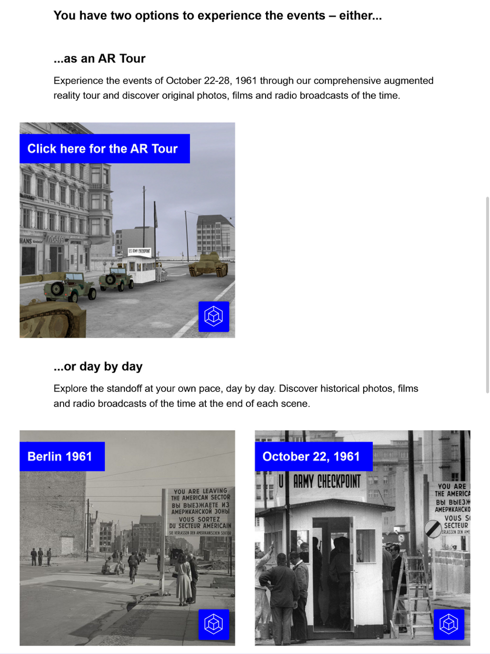 - Augmented Reality Tour: Relive the events of October 22-28, 1961 as a cohesive story in AR!