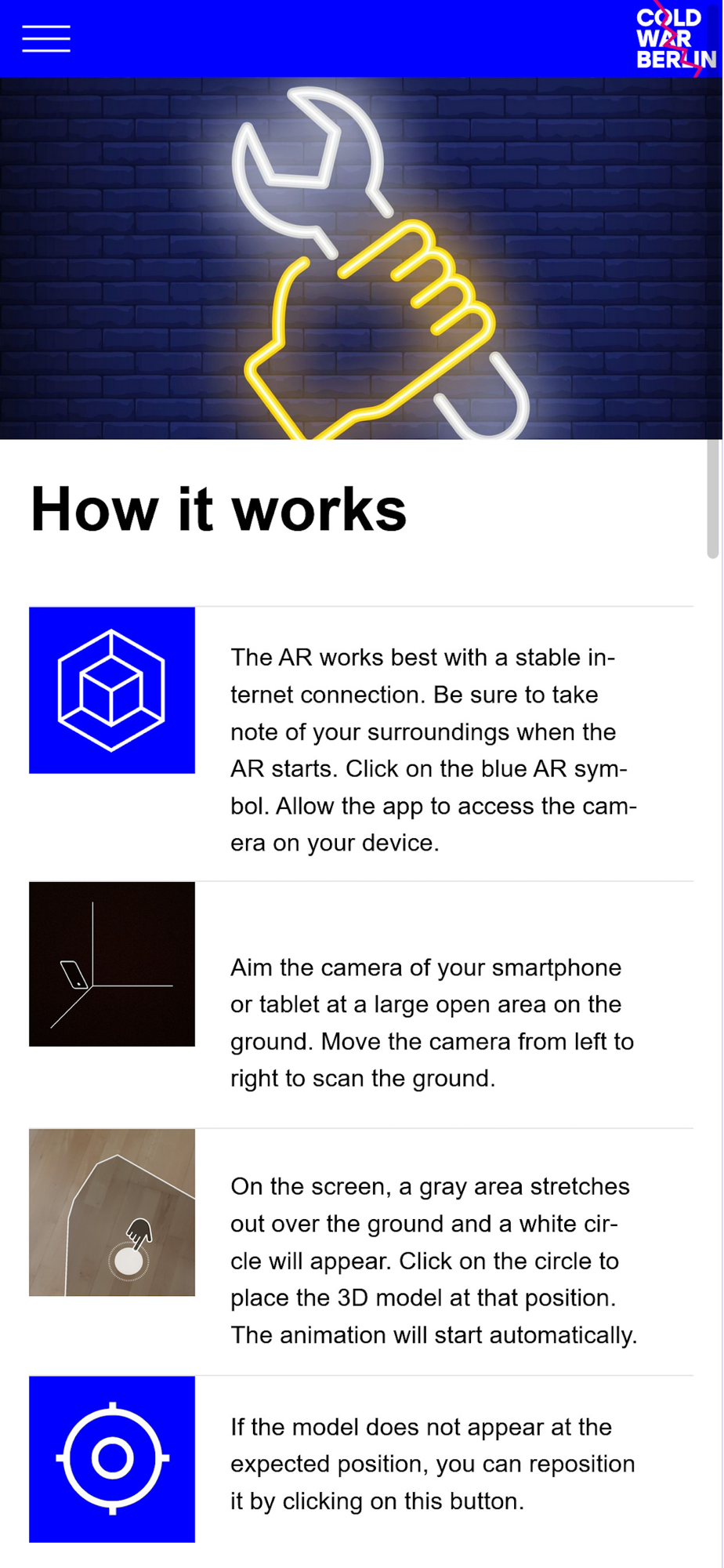 The integrated historical photos, films, and radio broadcasts show how the events were interpreted and portrayed differently in the East and West. The AR thus creates an innovative learning environment that conveys the events from different perspectives and facilitates a critical examination of one of the Cold War’s most iconic moments. It reveals both the role of the media in political events as well as the construction of historical images.
