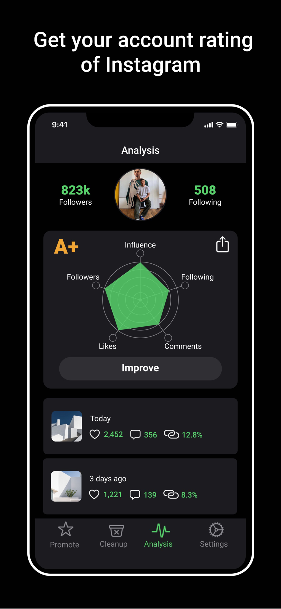 - Get your IG account rating (A+ ~ E-) and optimization strategies.