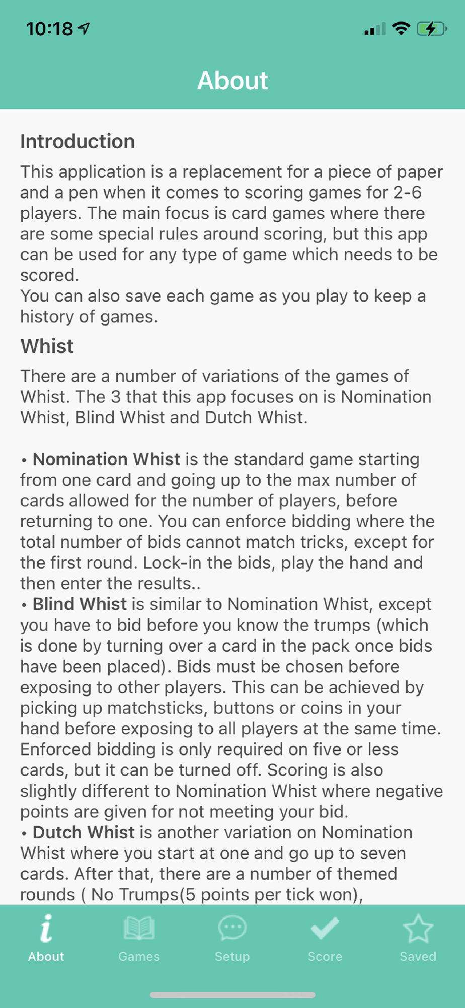 Whist Scorer is a replacement for a piece of paper and a pen when it comes to scoring games for 2-6 players.