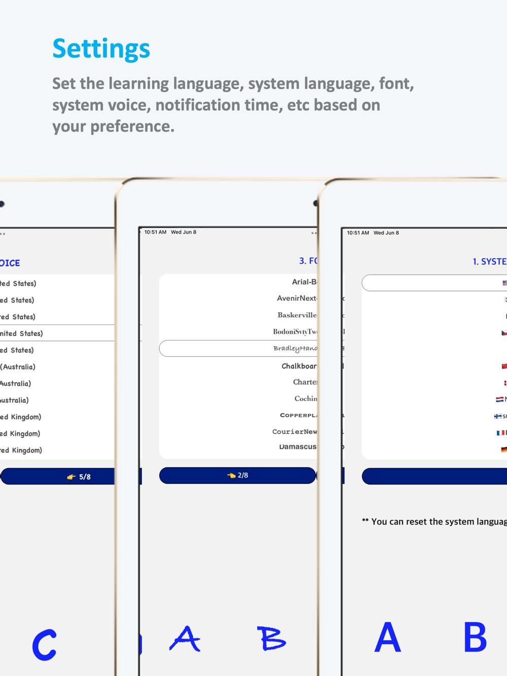 Set the learning language, system language, font, system voice, notification time, etc based on your preference.