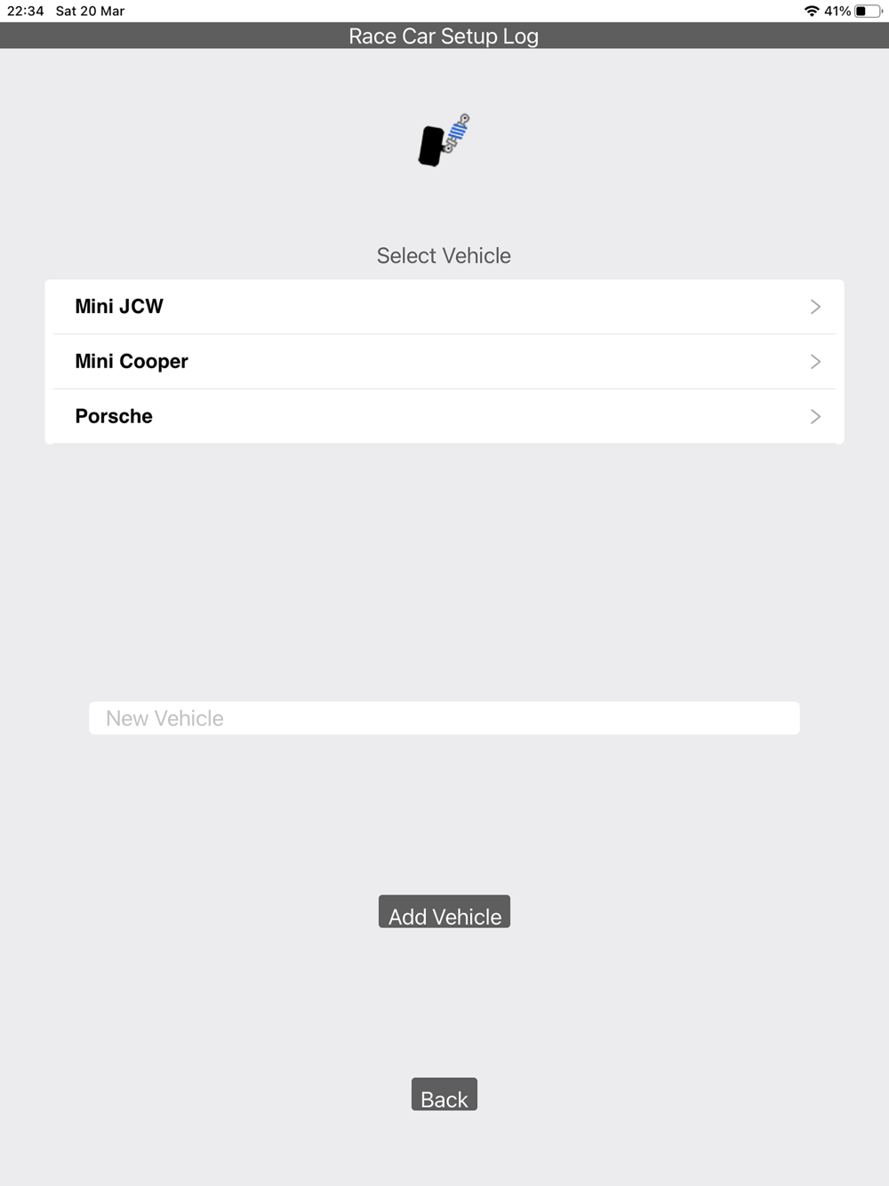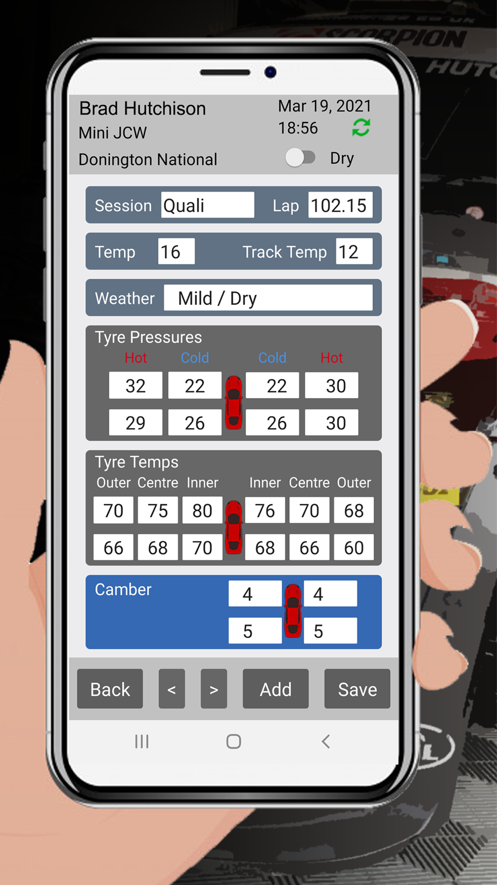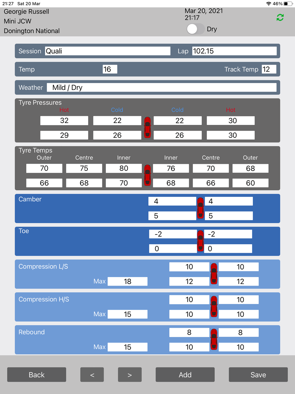 Race Car Setup Log stores your race car settings on your phone so all your previous setups and changes from every circuit are at hand where ever you are.