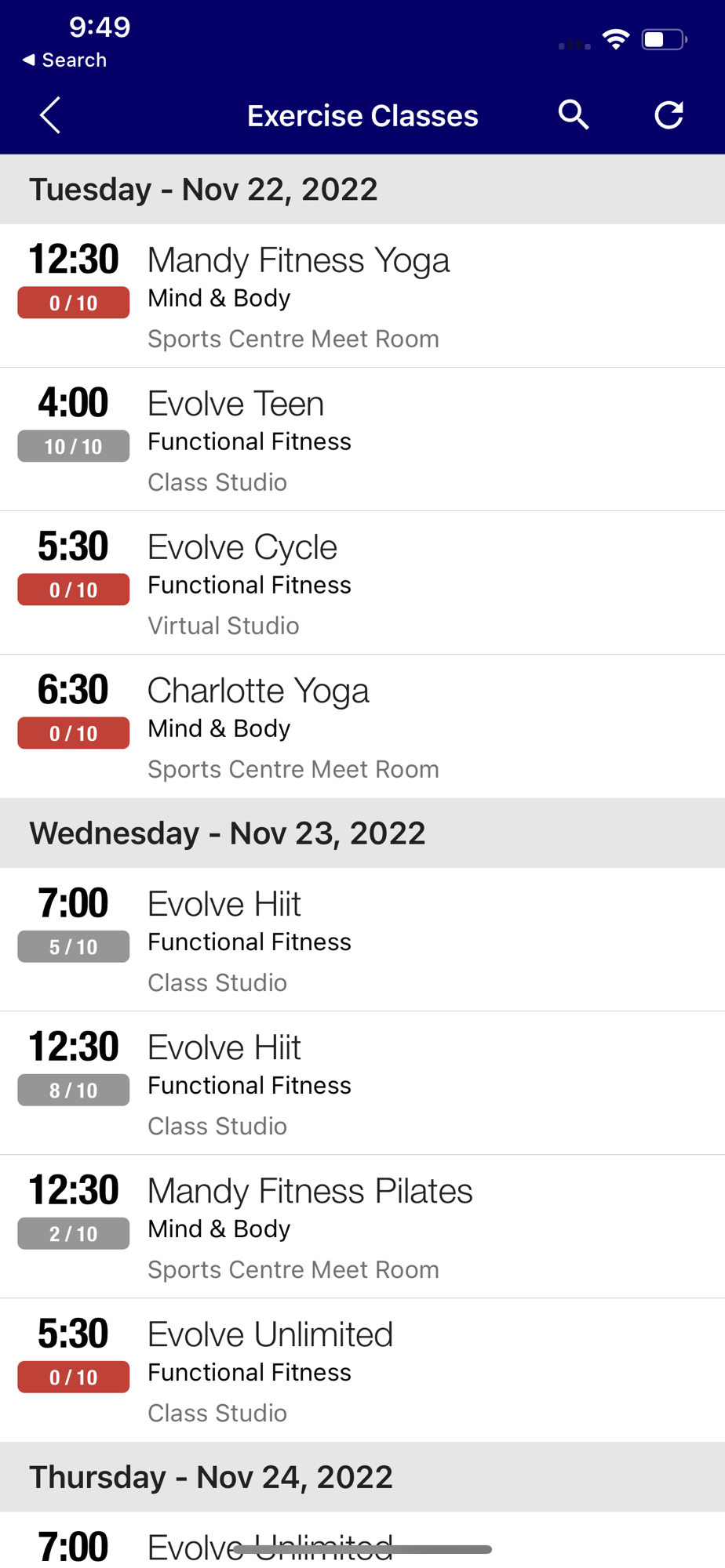 Mynediad amser real at amserlen dosbarthiadau eich canolfan, gan gynnwys amserau, hyfforddwyr ffitrwydd a disgrifiadau dosbarthiadau.