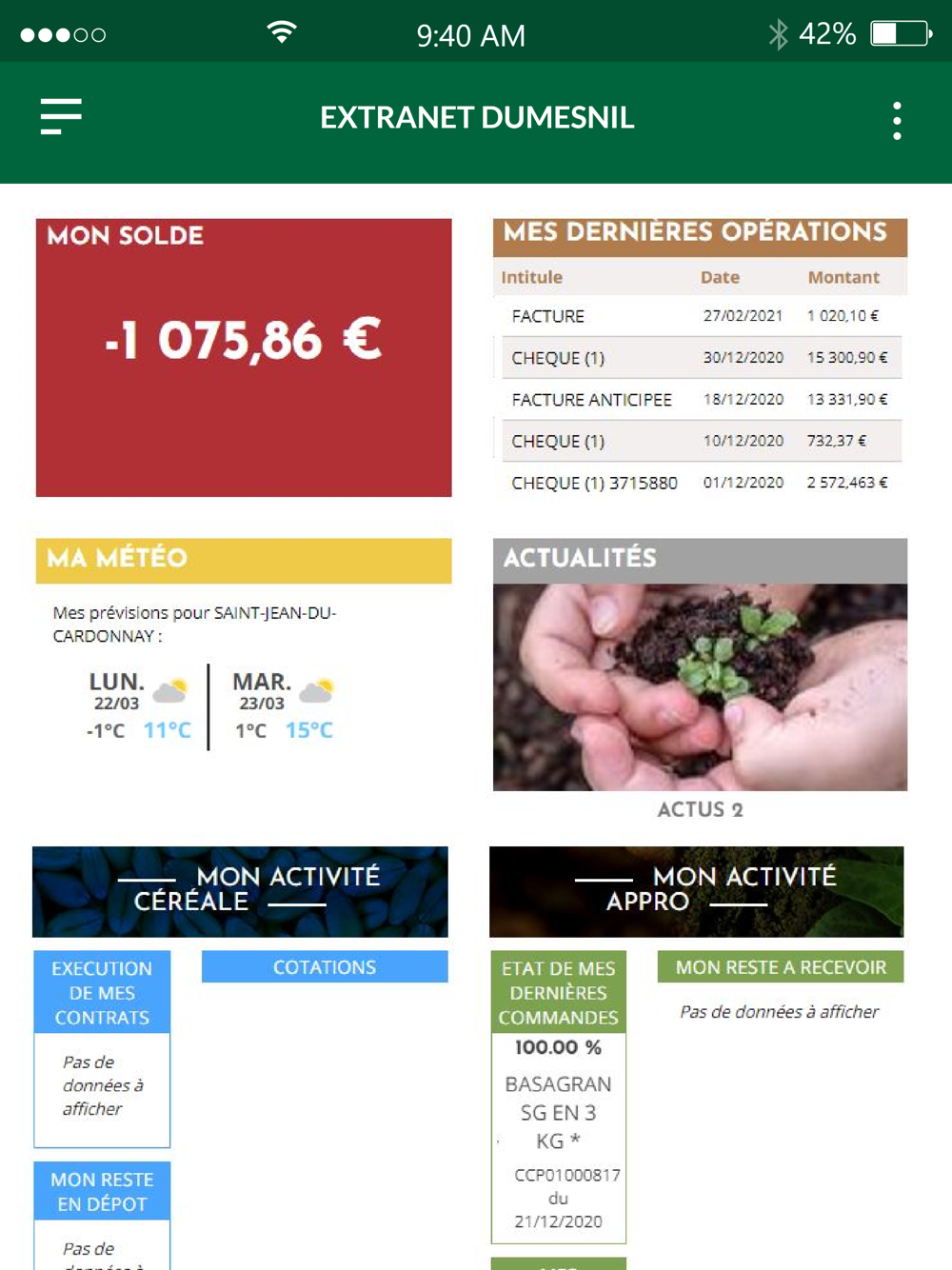 Vous pourrez également consulter les F.D.S. des derniers produits que vous avez commandés, les cotations et la météo agricole.