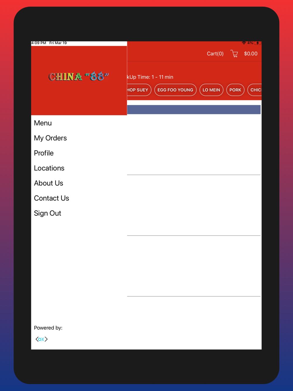 With China 88 App you can easily order your favorite food to pick up at our restaurant. All you need to do is open the app, look up in our menu, select your favorites, and your ready to go. You will have access to our full menu, day special, and track your order. Also, you could save your account info as well your previous orders, ask for special instructions. Just download, order, enjoy, and order again.