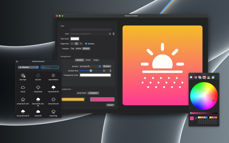 Choose from 2400 predefined icons, any emoji, or supply your own image file as the foreground.