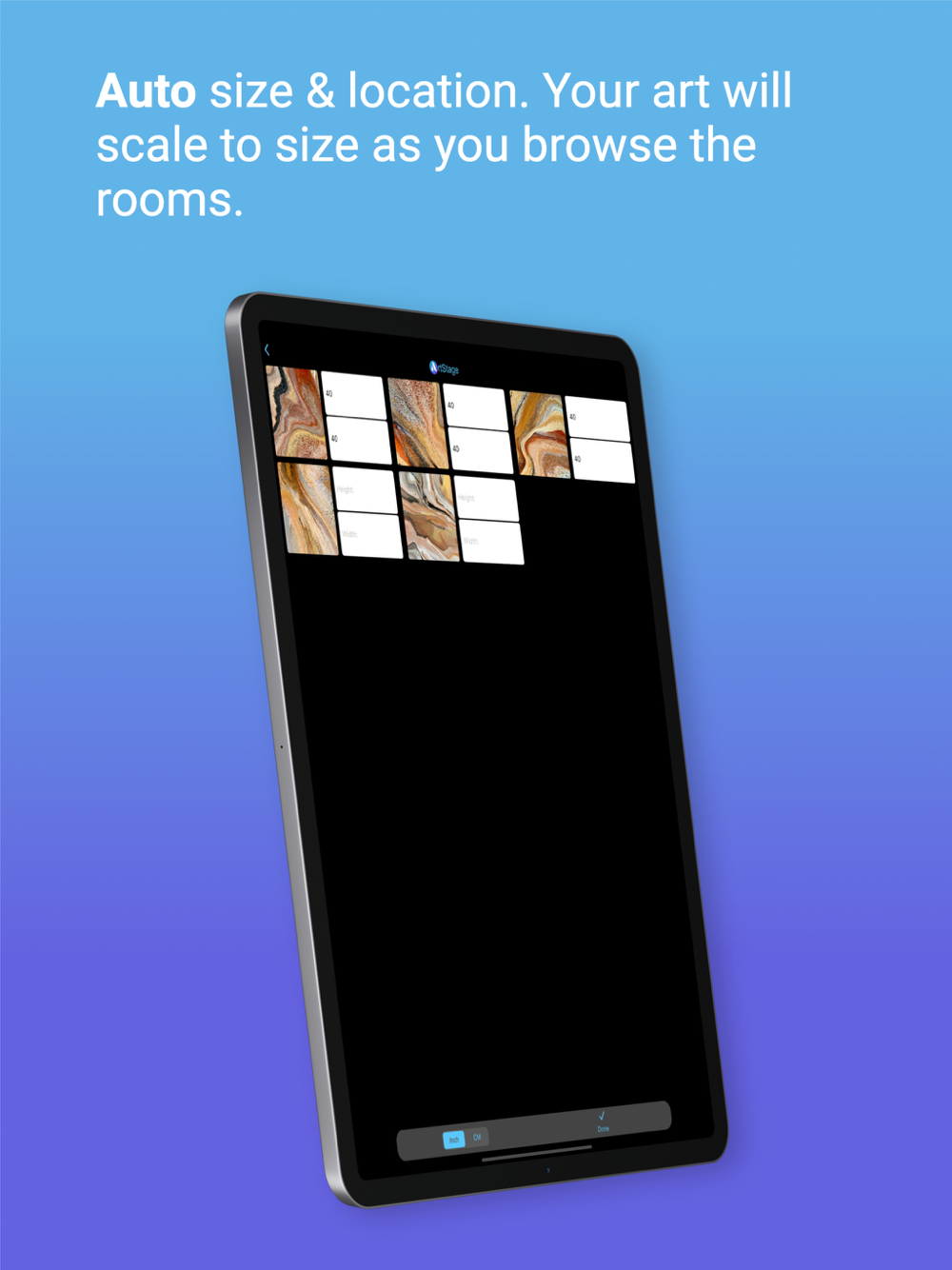 • Streamline the browsing experience for clients by entering artwork dimensions. ArtStage's auto-size and location feature intelligently scales and repositions your art.