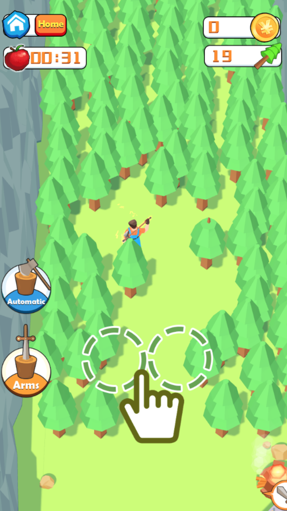 Endless hyper-casual idle game. Sharpen your axe to chop trees trough the woods.