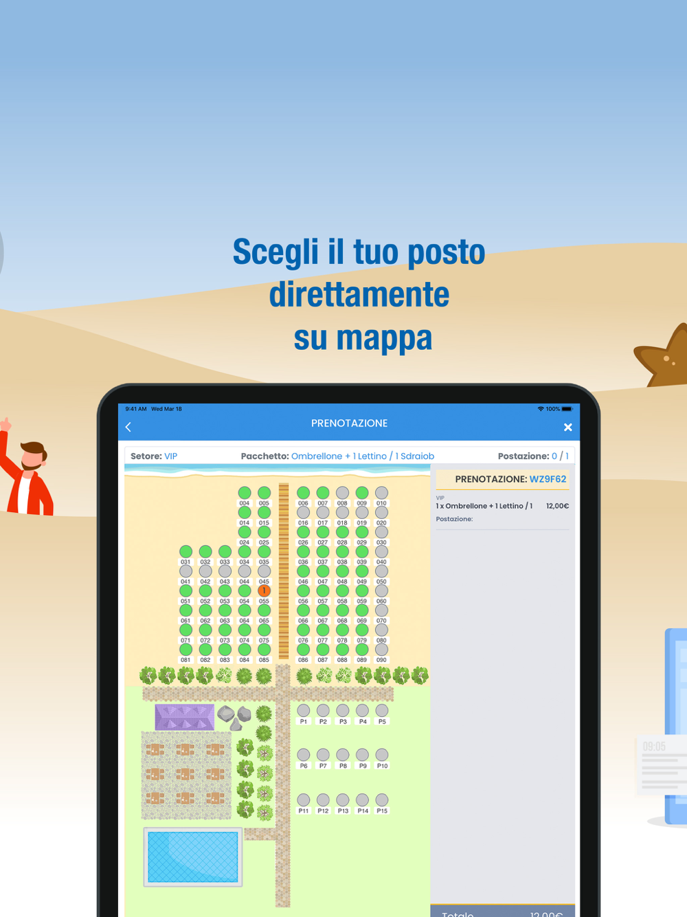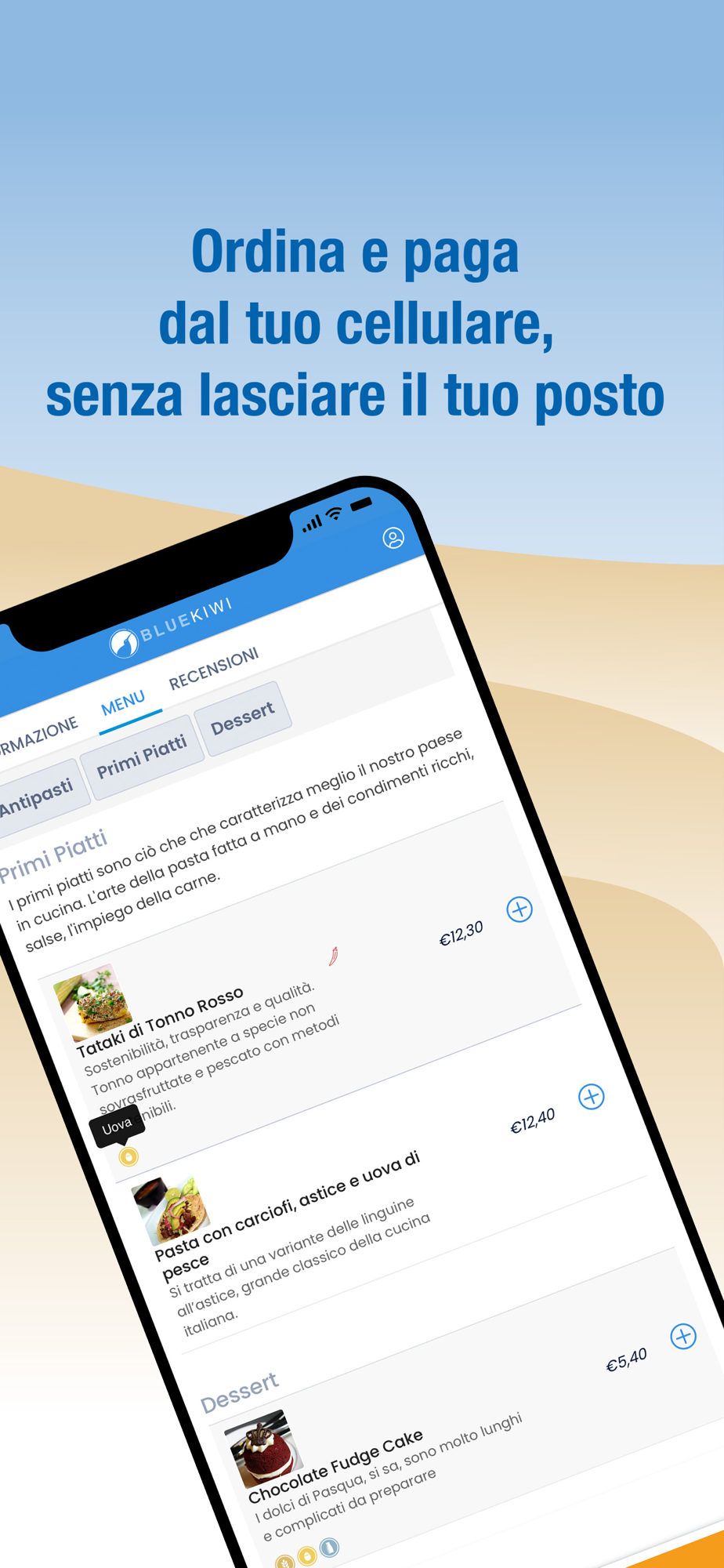 Con BLUEKIWI i clienti possono prenotare un tavolo o un ombrellone sul tuo Stabilimento Balneare o Ristorante, consultare il menu digitale o la lista dei servizi offerti e prenotarli direttamente dal tavolo o dal lettino in spiaggia.