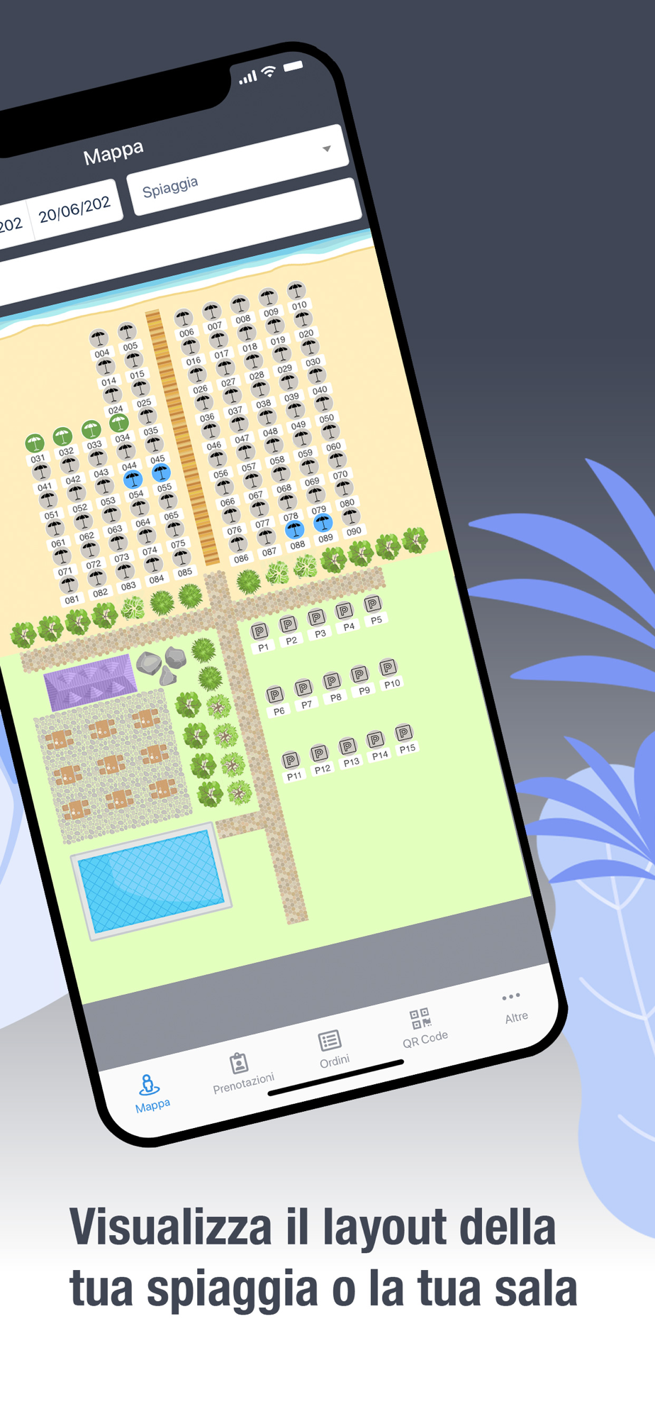 Dalla Mappa potrai visualizzare il layout della tua spiaggia o la tua sala e controllare la disponibilità dei tavoli o degli ombrelloni.