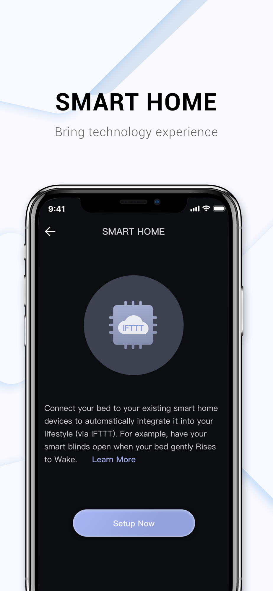 Connected Bed APP focuses on creating a beautiful home system. The App interface is simple and beautiful, and users can intelligently link with smart home settings. They can control the smart electric bed before going to bed, get snoring intervention during sleep, and view the snoring report after waking up to help users improve sleep quality and optimize user sleep experience.