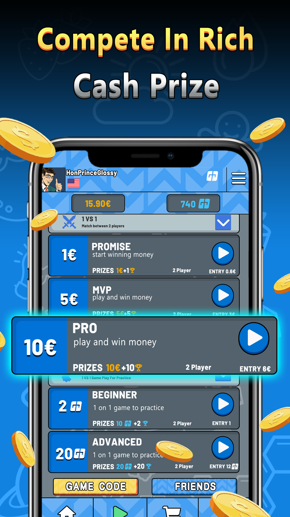 • Thêm bất kỳ người dùng nào làm bạn và thách đấu trực tiếp với anh ta. Thách thức bạn bè của bạn và thể hiện ai là nhà vô địch bằng cách giành giải thưởng!