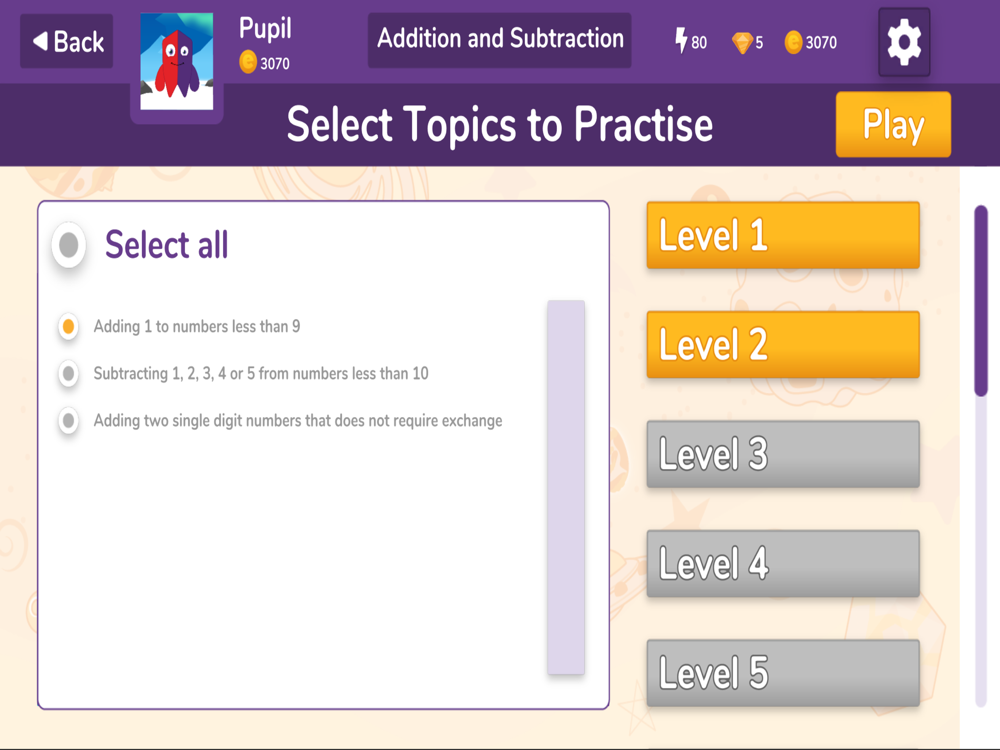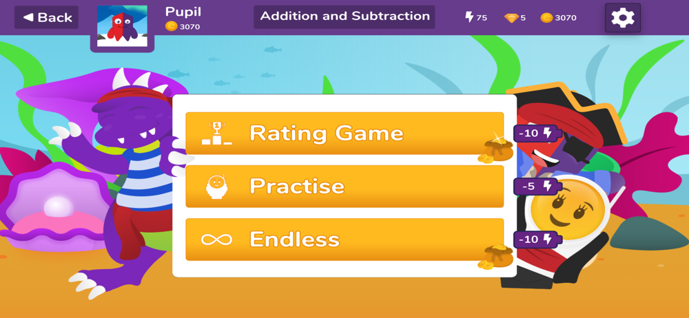 Children can practise their adding and subtracting, multiplication times tables and fractions with our Challenge mode where they can:
