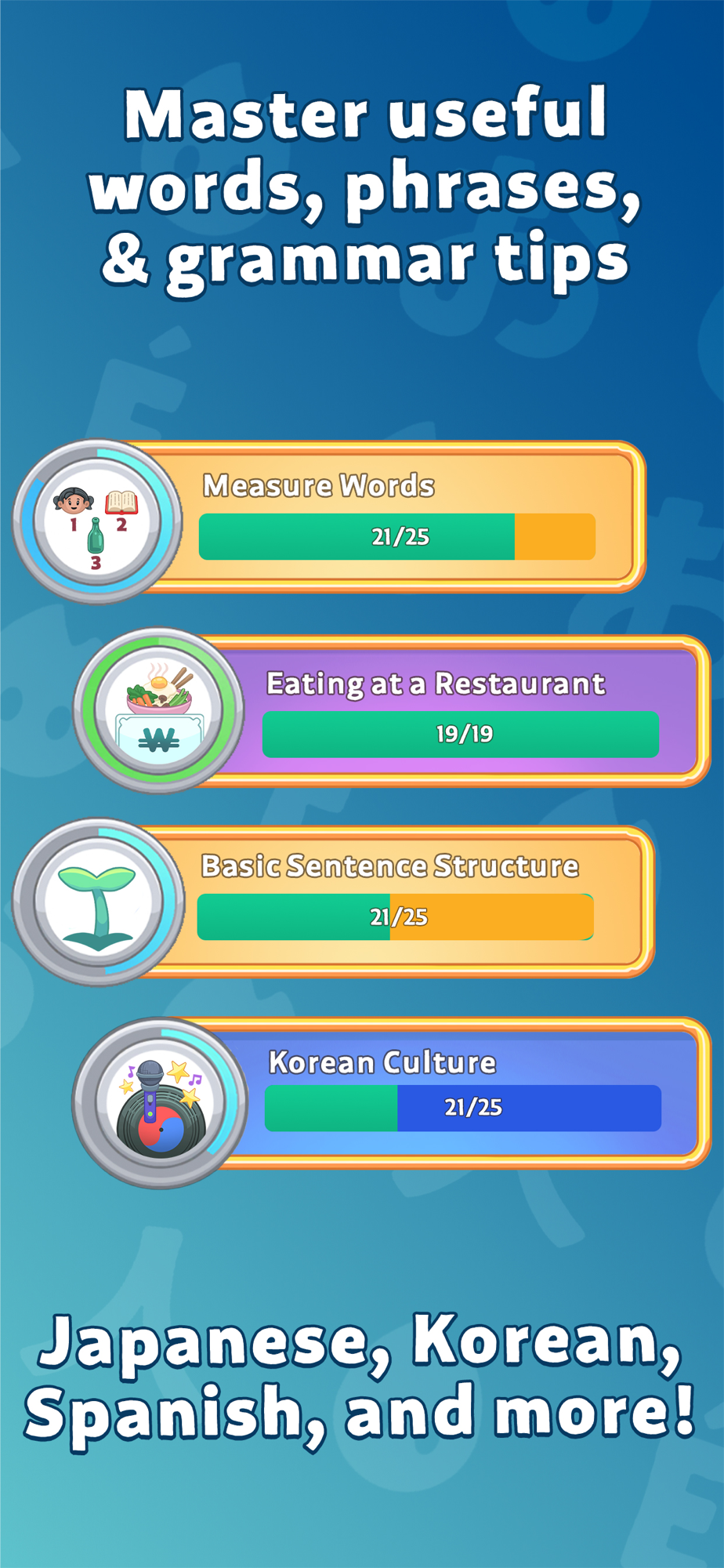 - Learn words and phrases that are relevant with content organized around useful themes like Ordering Food and Meeting New People