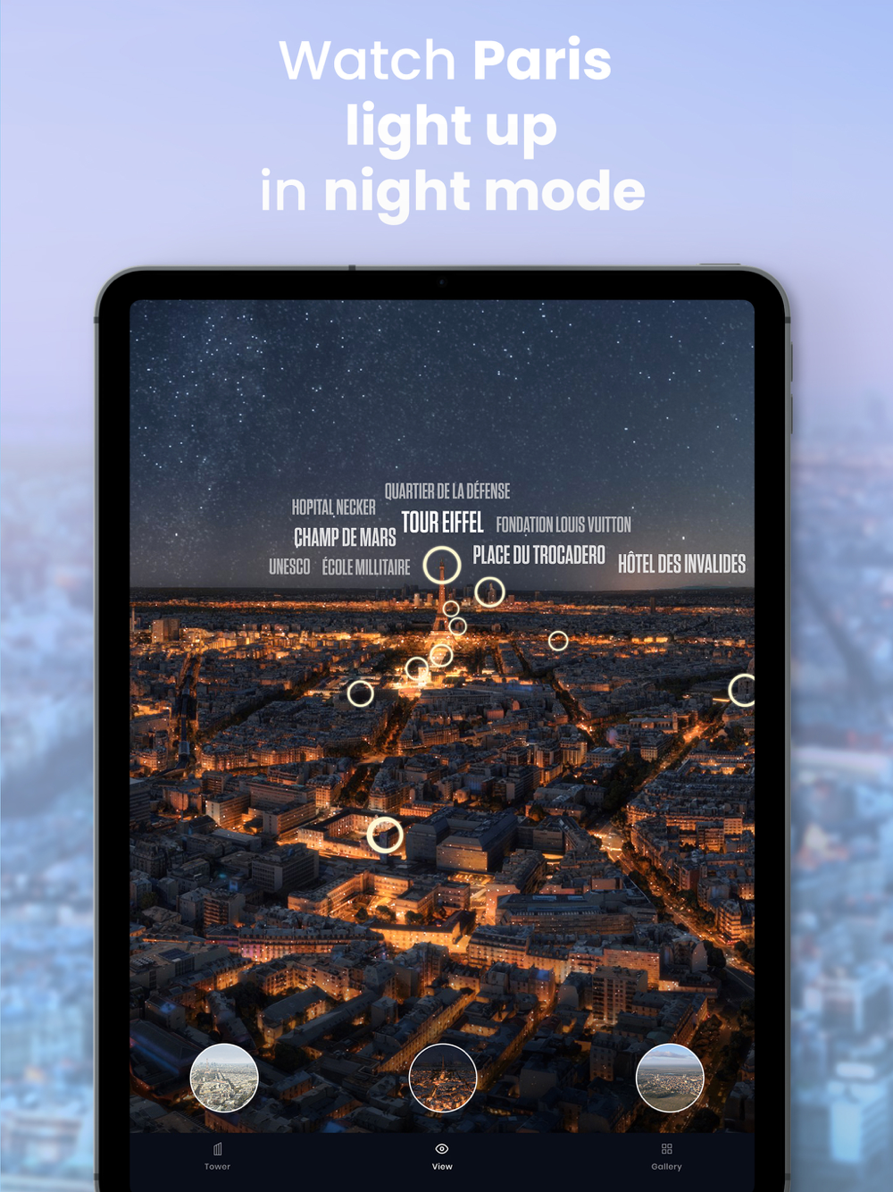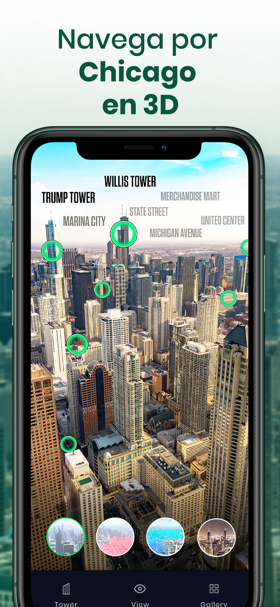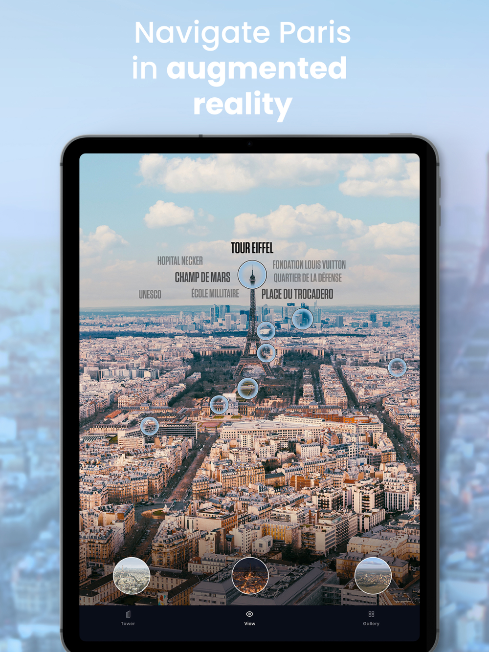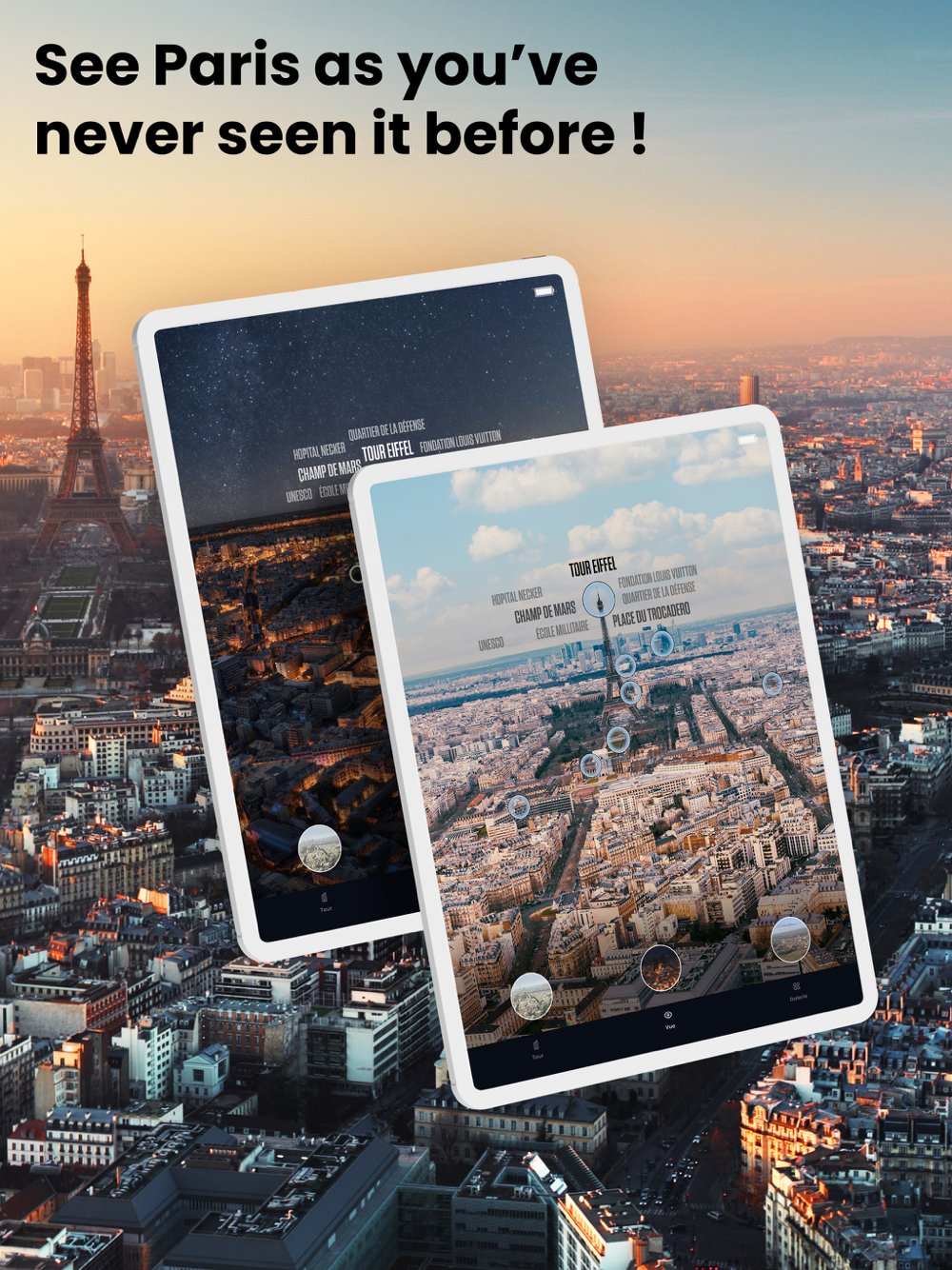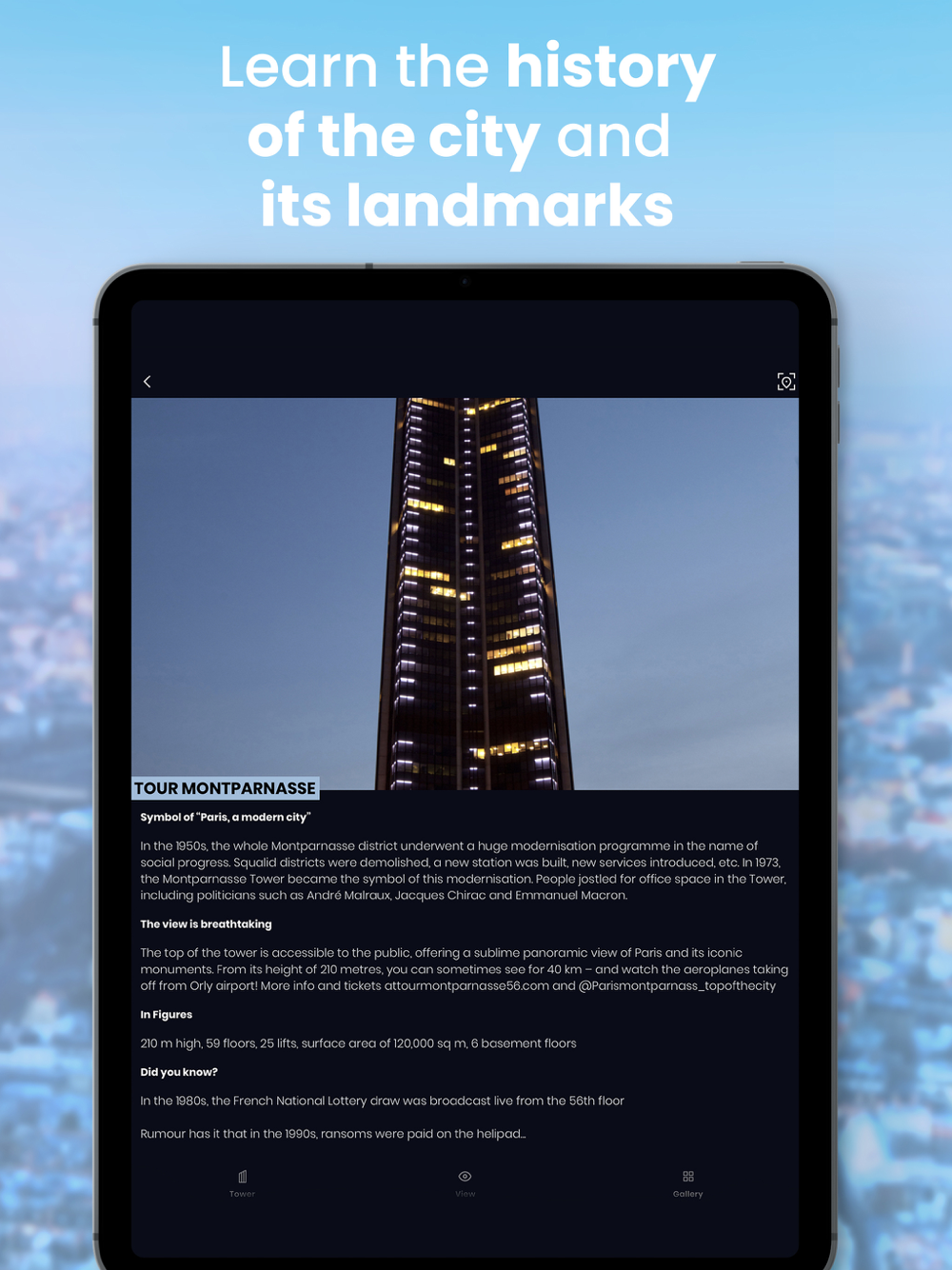 Nuestra mapa de realidad aumentada te guía desde la parte superior del edificio hasta el corazón de la ciudad. Aparecen lugares icónicos y se superponen con vistas panorámicas.