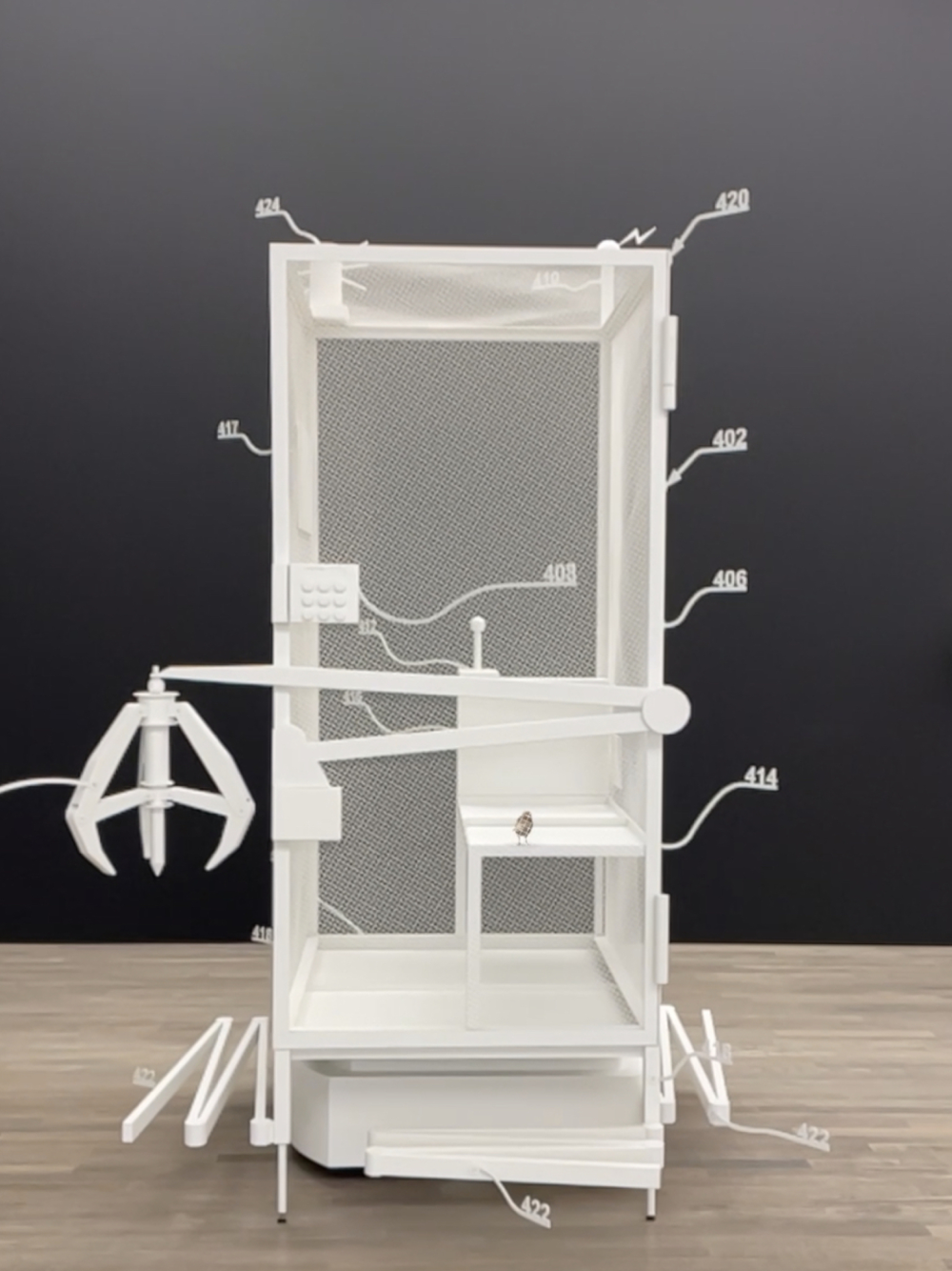 Simon Denny, Amazon worker cage patent drawing as virtual Aquatic Warbler