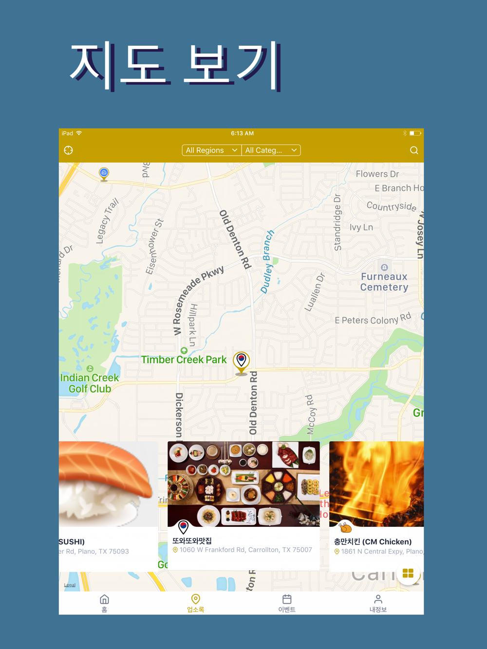 이 앱은 달라스의 한인식당, 맛집, 여행 등의 정보와 위치를 제공하고 달라스 여행에 필요한 이벤트 정보를 제공합니다.