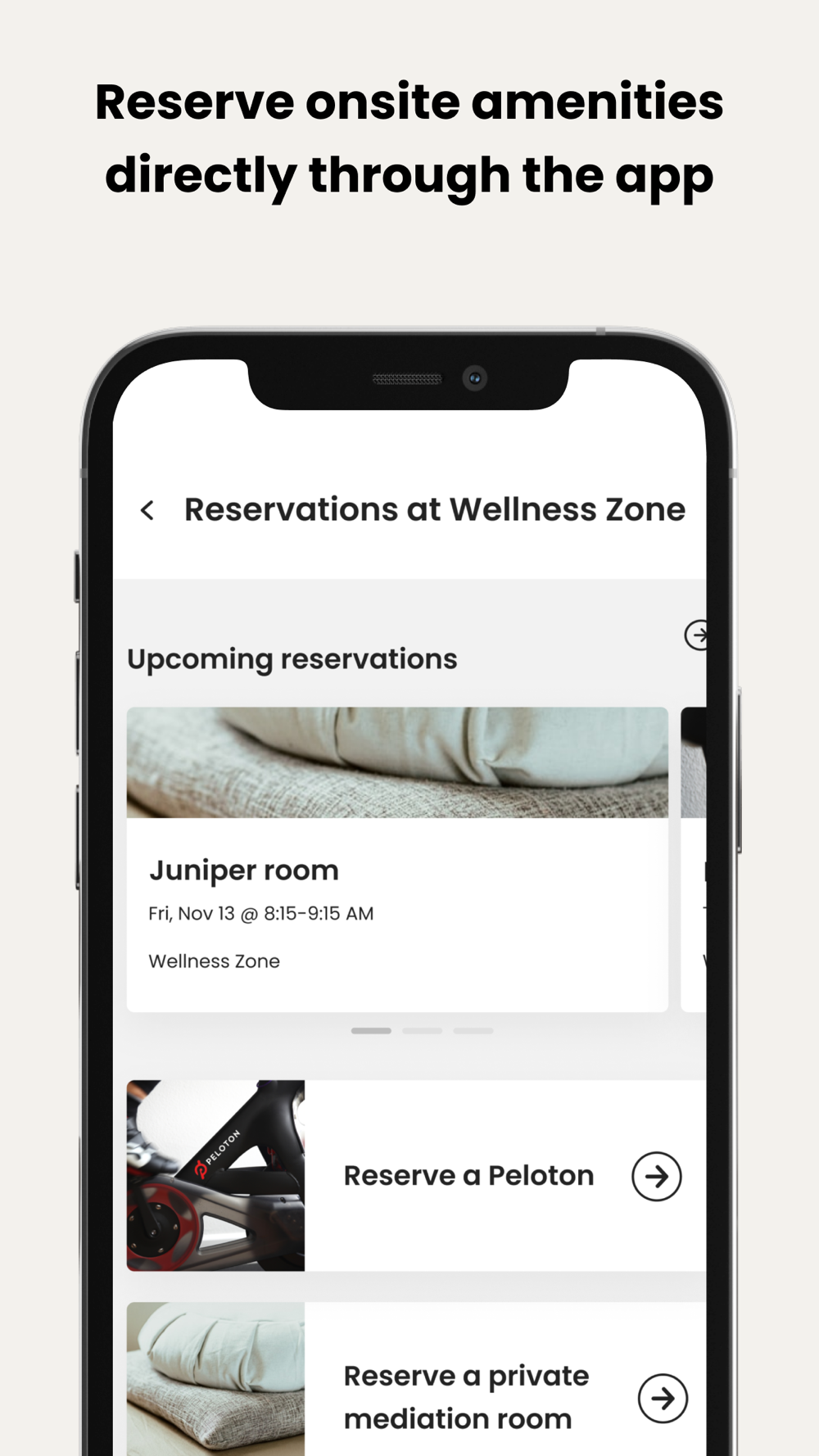 Reserve Amenities: Enjoy peace of mind knowing that your preferred amenities are ready and waiting when you arrive. Our app allows you to reserve peloton bikes, meditation rooms, wellness rooms, and more.