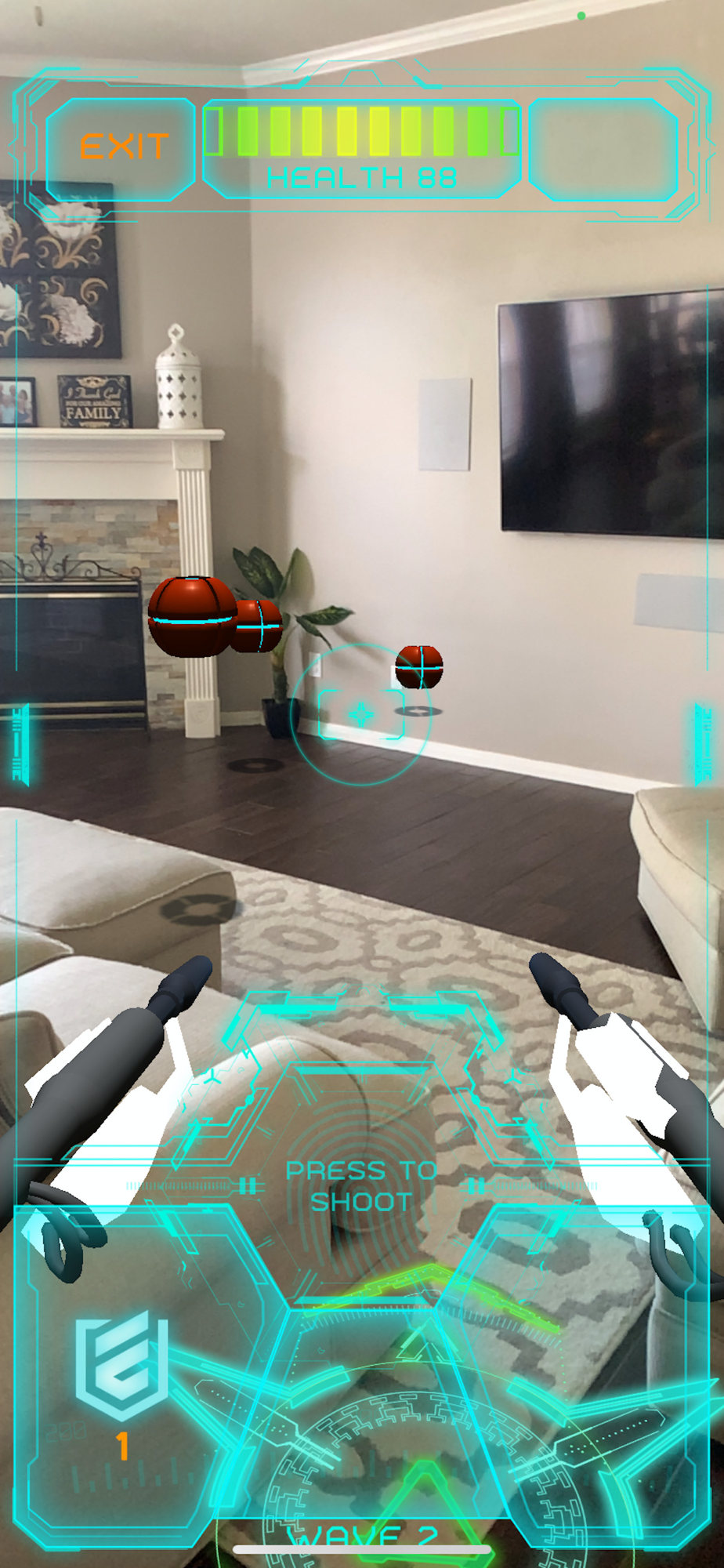 Maintain a defensive position against never-ending waves of enemies in augmented reality. See how long you can stay alive to kill as many enemies as possible in this simple 3D shooter. Each level gets faster and more difficult. Shoot the enemies, gain health and powerups. Be quick and accurate!