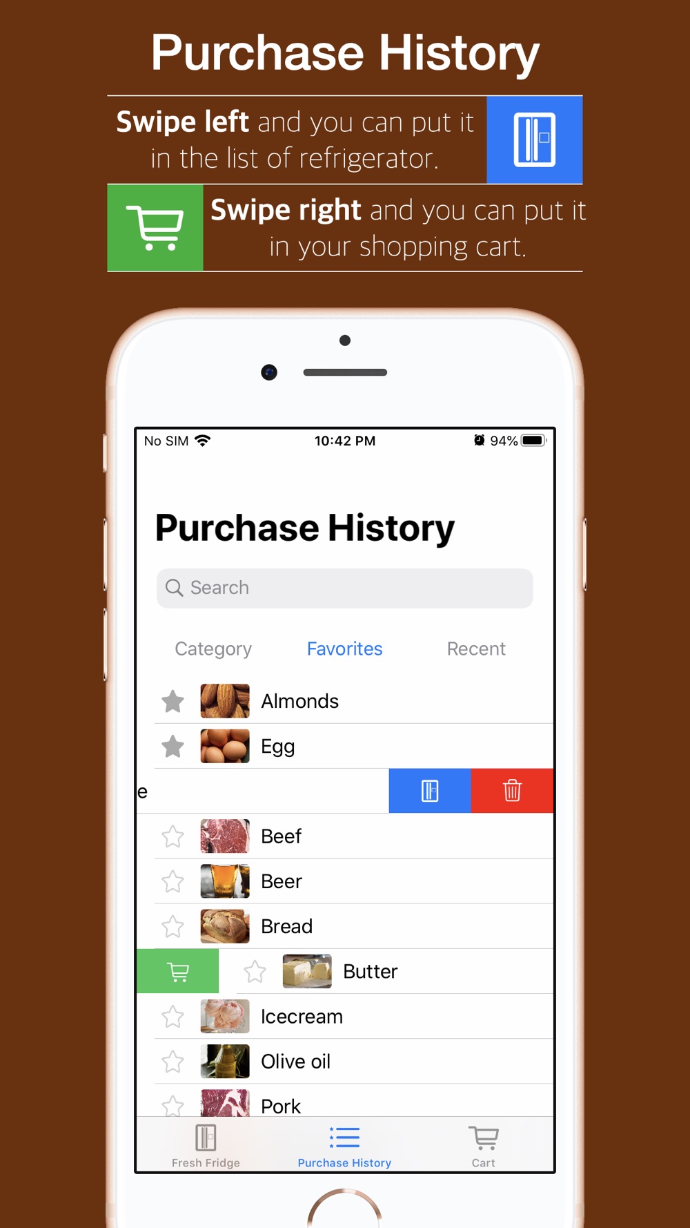 - Intuitive food list-up: With a simple and quick swipe, you can move the food in the refrigerator, purchase list, and shopping cart freely.
