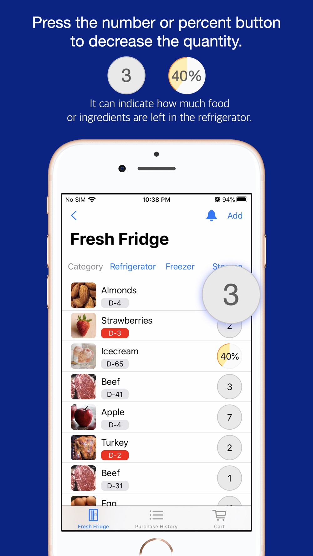 - One-touch refrigerator food management: In a neat format of the refrigerator food list, touch the pie-chart and adjust the amount remaining.