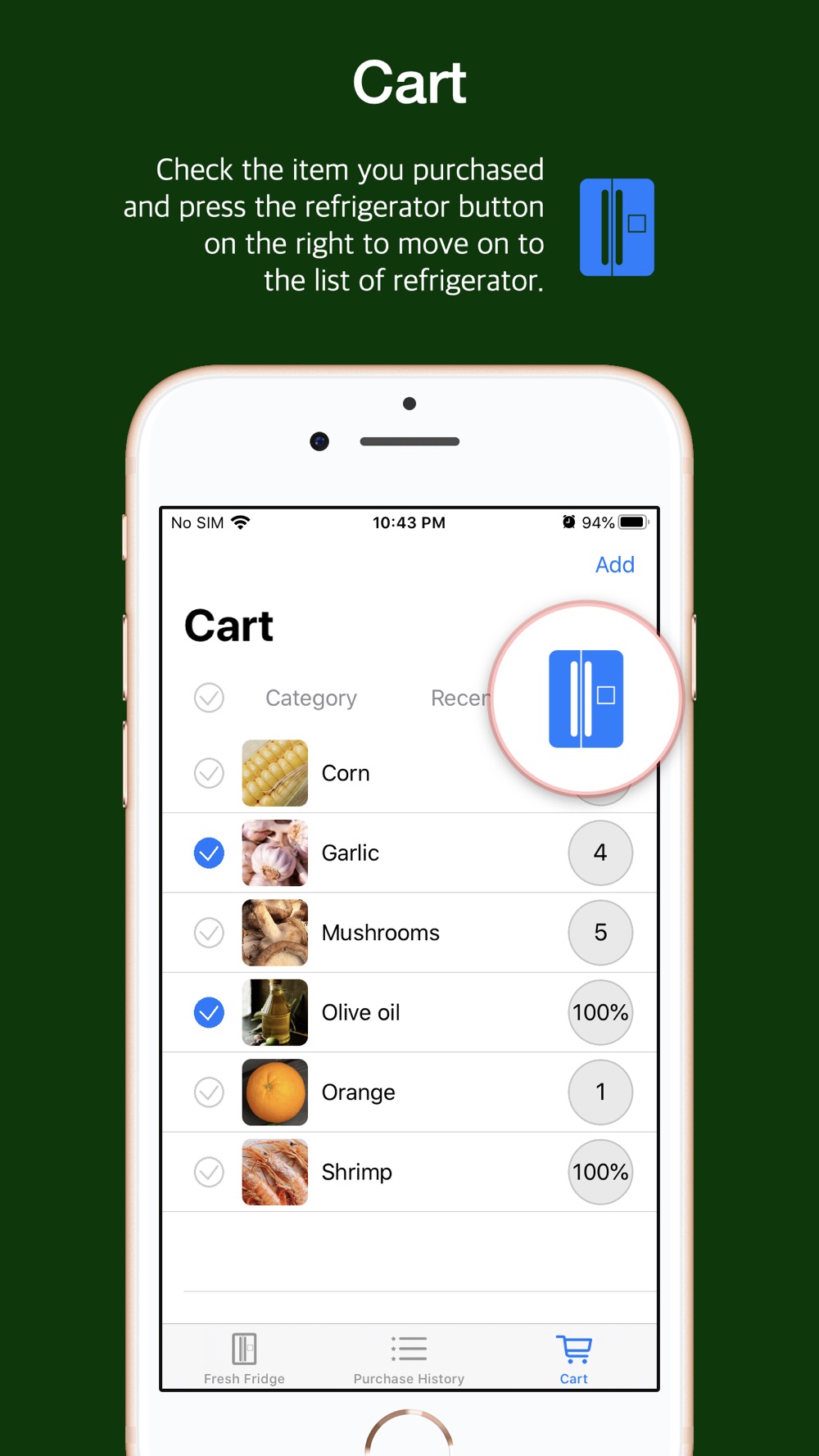 - Fill the refrigerator with food by using a checkbox: Put the foods that you bought at the mart into the refrigerator at one go with the checkbox.