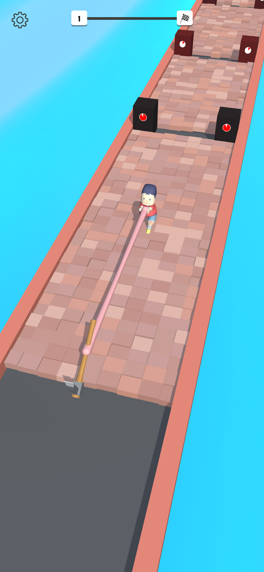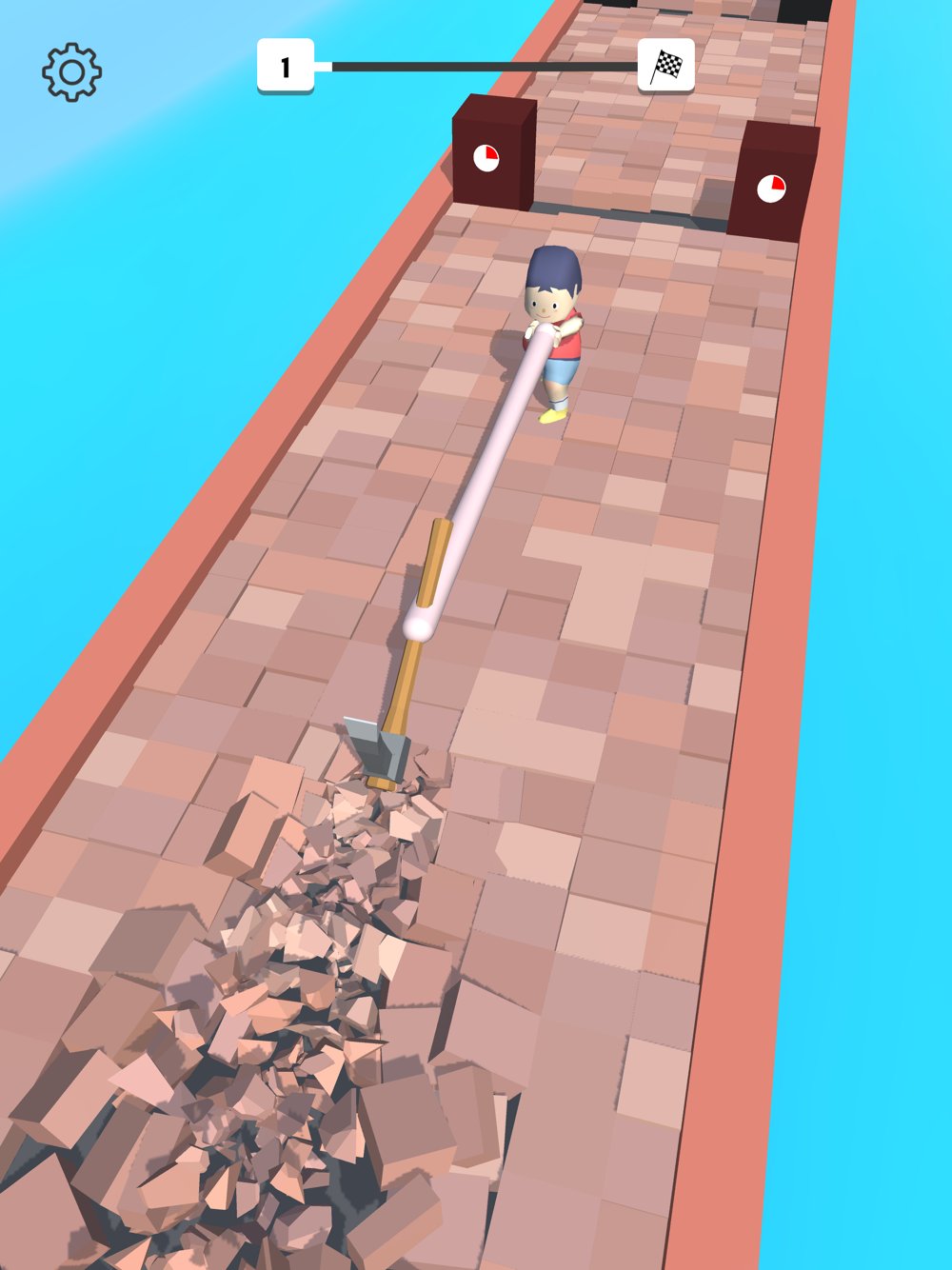 - Tap and hold to move/stretch player away pick axe, then release to pull the pick axe and destroy everything in the path.