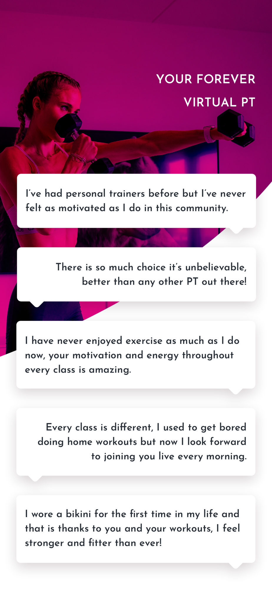 You can either join a brand new workout with Belle on the live stream every morning from wherever you are or choose from a huge library of on demand workouts (saved live workouts) ranging from HIIT, Sculpt and Cardio to Mobility and Pilates.